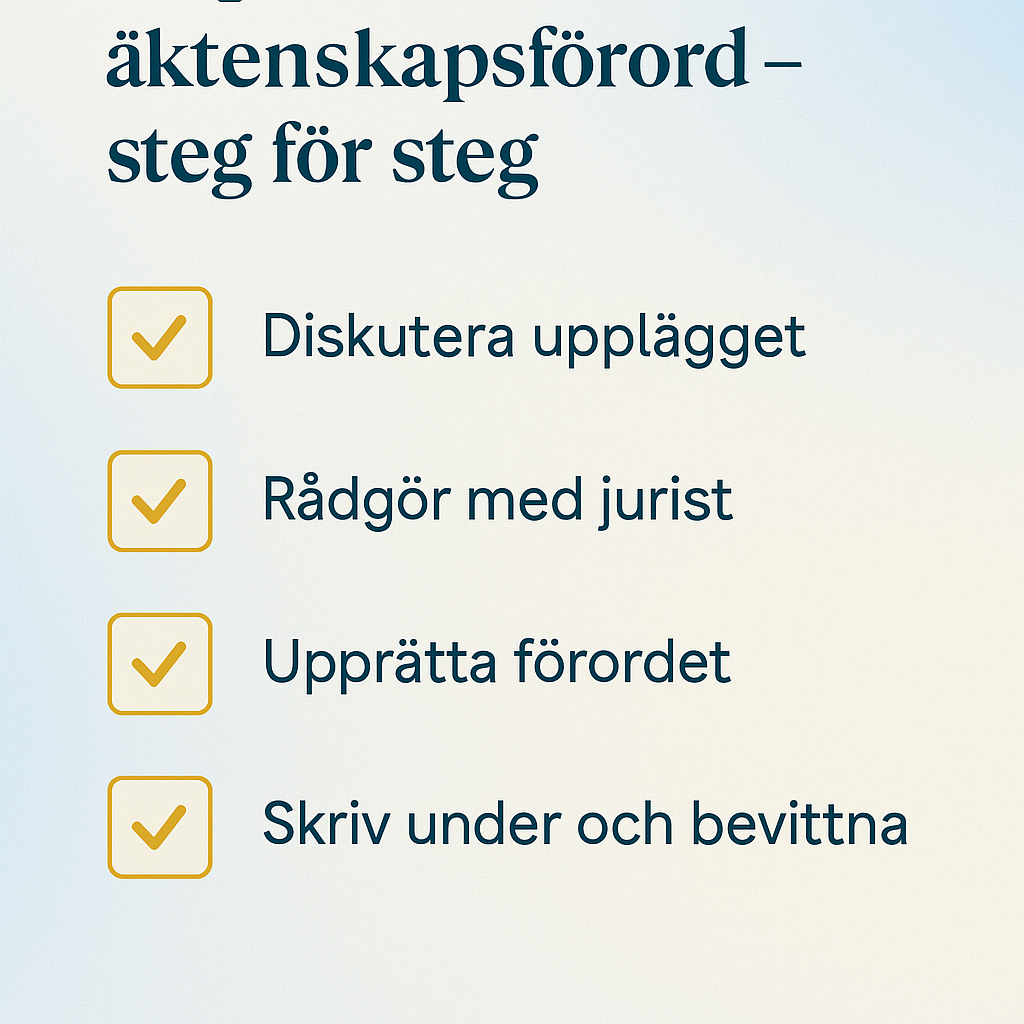 Skapa ett giltigt Àktenskapsförord pÄ 5 minuter. Framtaget av svenska jurister, uppdaterat enligt 2025 Ärs lagstiftning.
