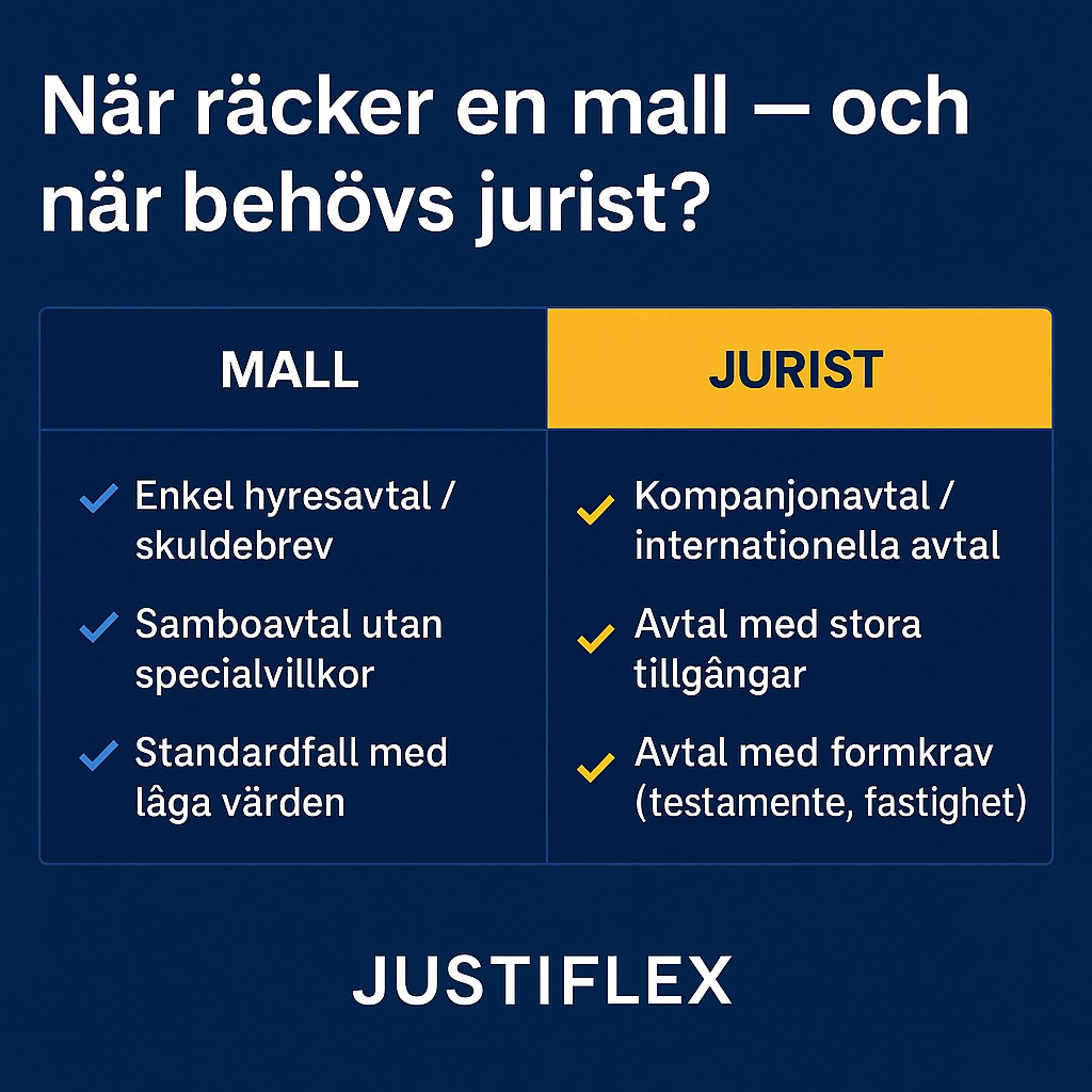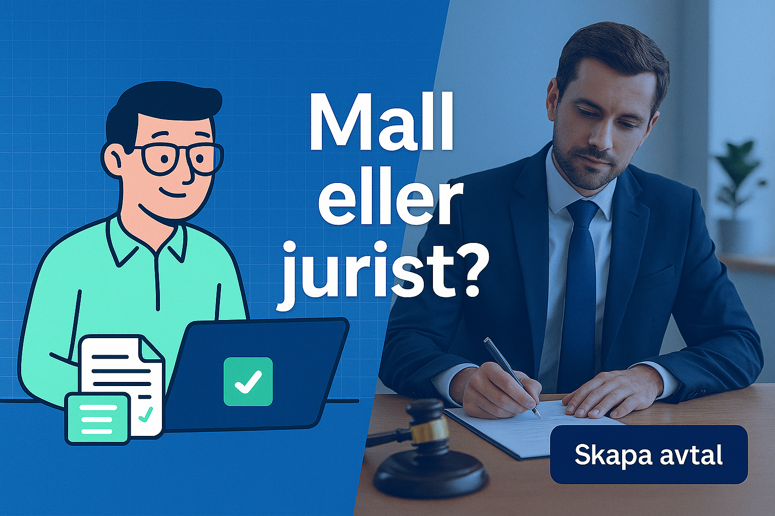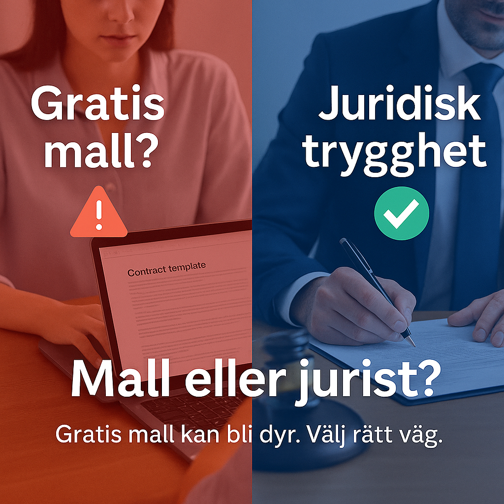 Varför vĂ€lja? Med en mall fĂ„r du grunden snabbt och billigt â med jurist fĂ„r du tryggheten. Kombinationen ger dig en robust juridisk lösning utan onödiga kostnader.