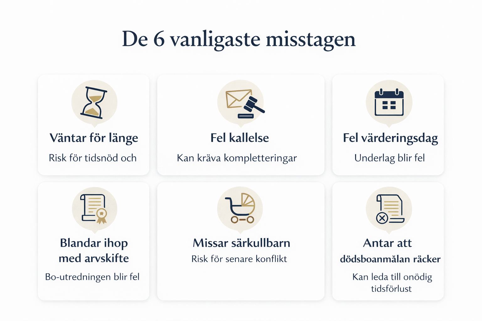Det är också här många gör samma misstag: man tror att bouppteckningen kan vänta tills allt “lugnat ner sig”. I verkligheten är det ofta precis tvärtom. Ju senare man börjar, desto större är risken att underlag saknas, kallelser blir fel eller att anstånd måste sökas i sista stund.