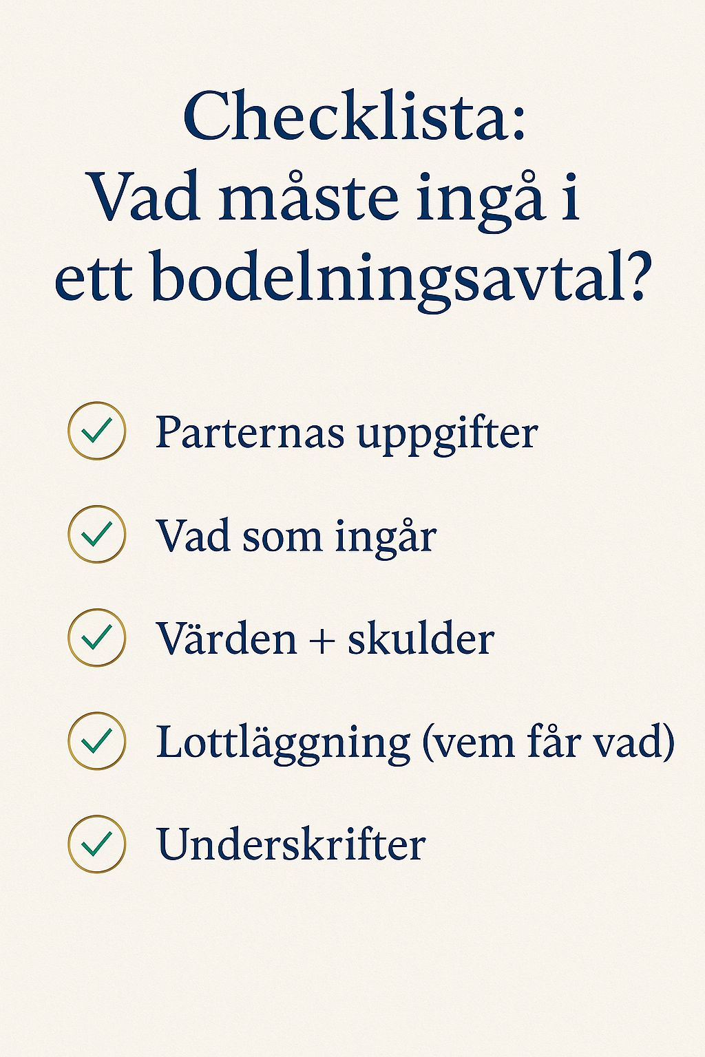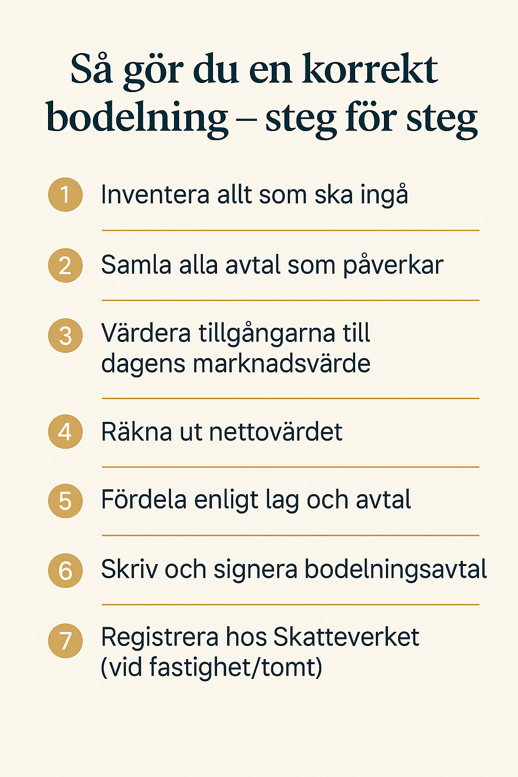 ⚠️ Ingen tidsfrist: En make kan begära bodelning flera år efter skilsmässan om inget avtal upprättats (se bl.a. NJA 2009 s. 437).