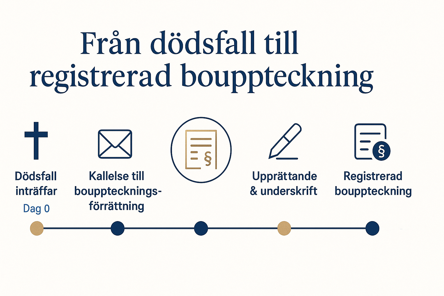 | 3. Bouppteckningsförrättning | Genomgång av tillgångar, skulder och juridiska handlingar. | Inom 3 månader | Bouppgivaren bekräftar uppgifterna på heder och samvete. |