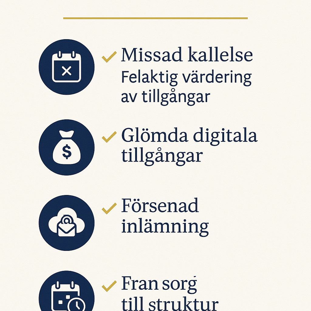 ✅ Lösning: Använd rekommenderade brev eller digitalt bevis (BankID-signering).❌ Felaktig värdering av tillgångar – Underskattning kan skapa arvstvister.