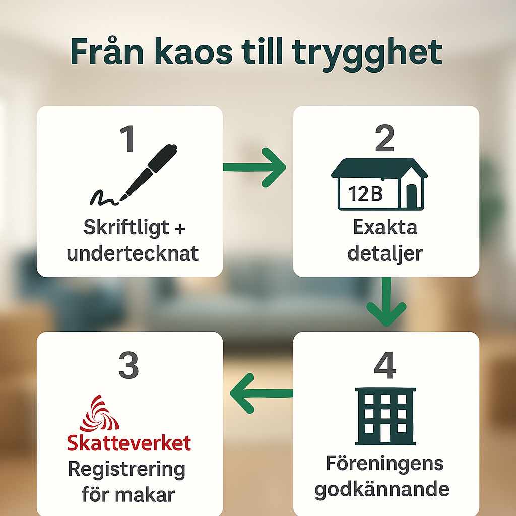 ❌ Sanningen: Lagen är stenhård. En gåva av bostadsrätt måste vara skriftlig för att gälla. Annars stoppas allt – från föreningen till domstolen.