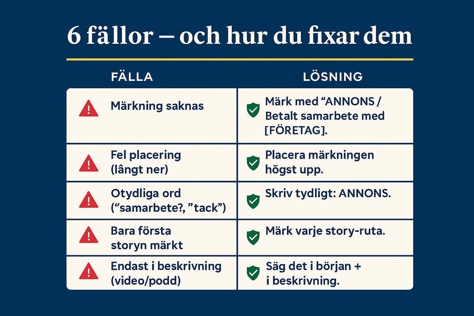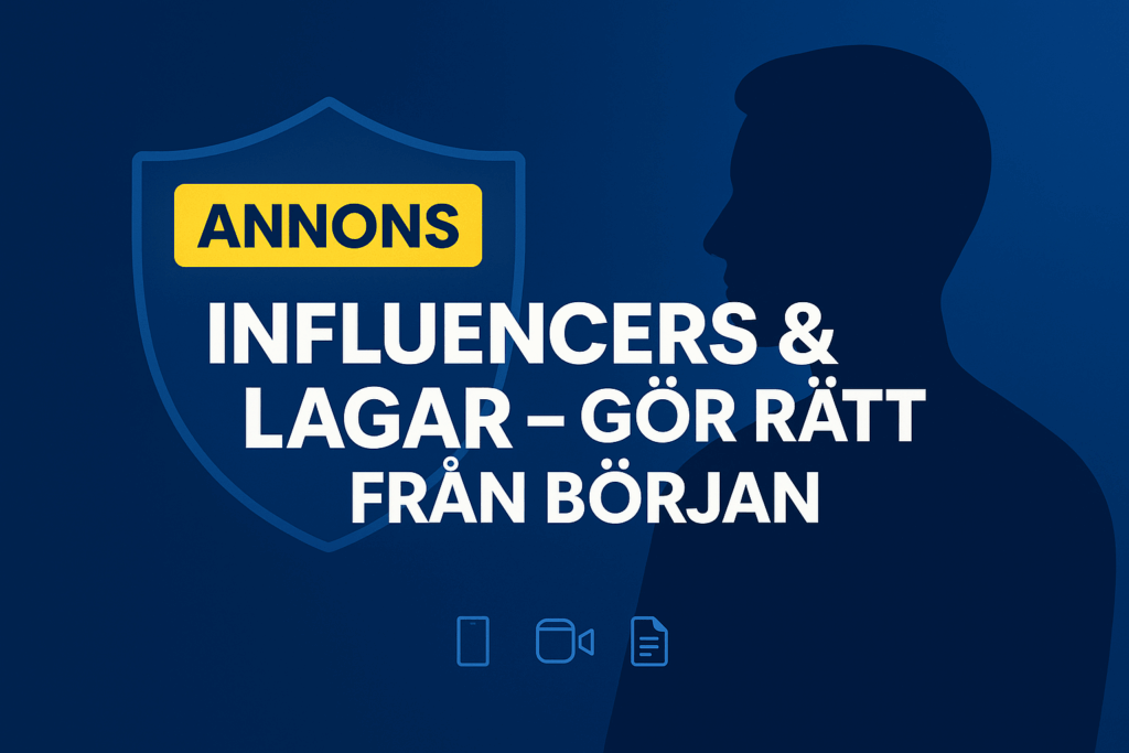 Märk reklam direkt och tydligt (ANNONS / Betalt samarbete med [FÖRETAG]), skriv sponsoravtal innan publicering, prissätt öppet (leverans + licens + tillval), undvik 6 klassiska fällor. Konsumentverket har öppnat ~50 tillsynsärenden – och flera har nu gått vidare till KO.