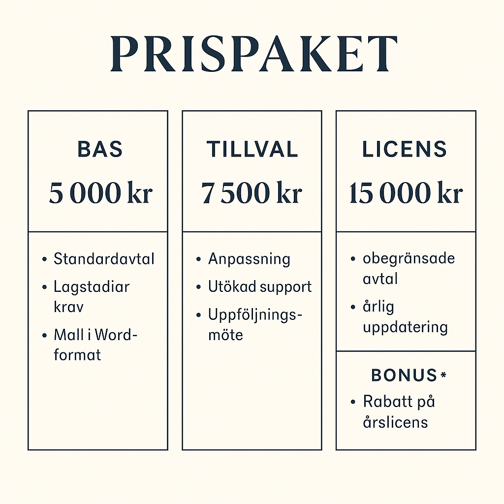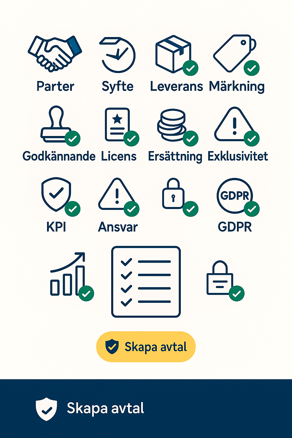 ✔️ reklammärknings-klausuler • ✔️ licenser/whitelisting • ✔️ KPI/bonus • ✔️ checklista