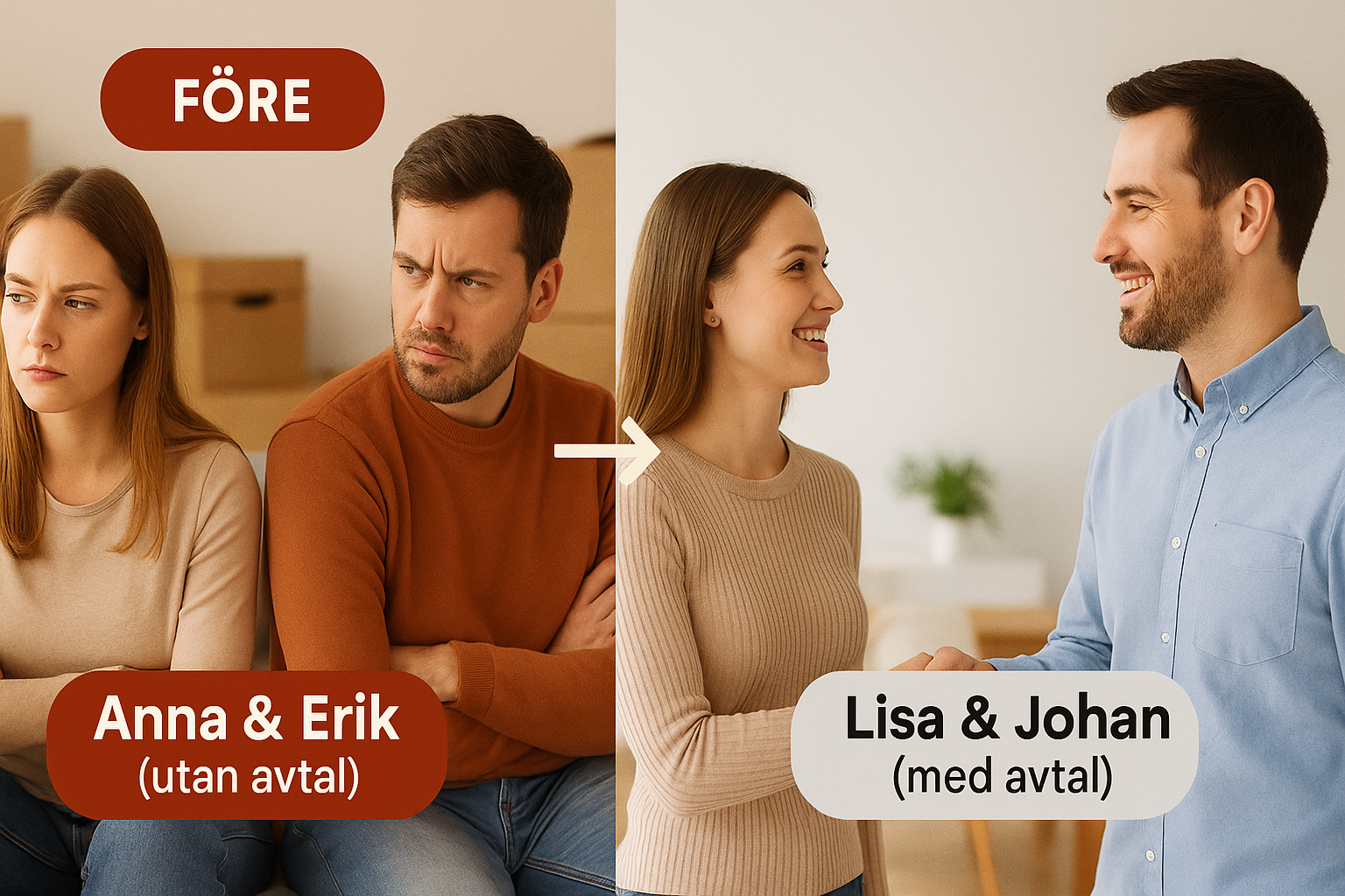 👉 Ett samboavtal kompletterar detta perfekt – både vid separation och dödsfall.