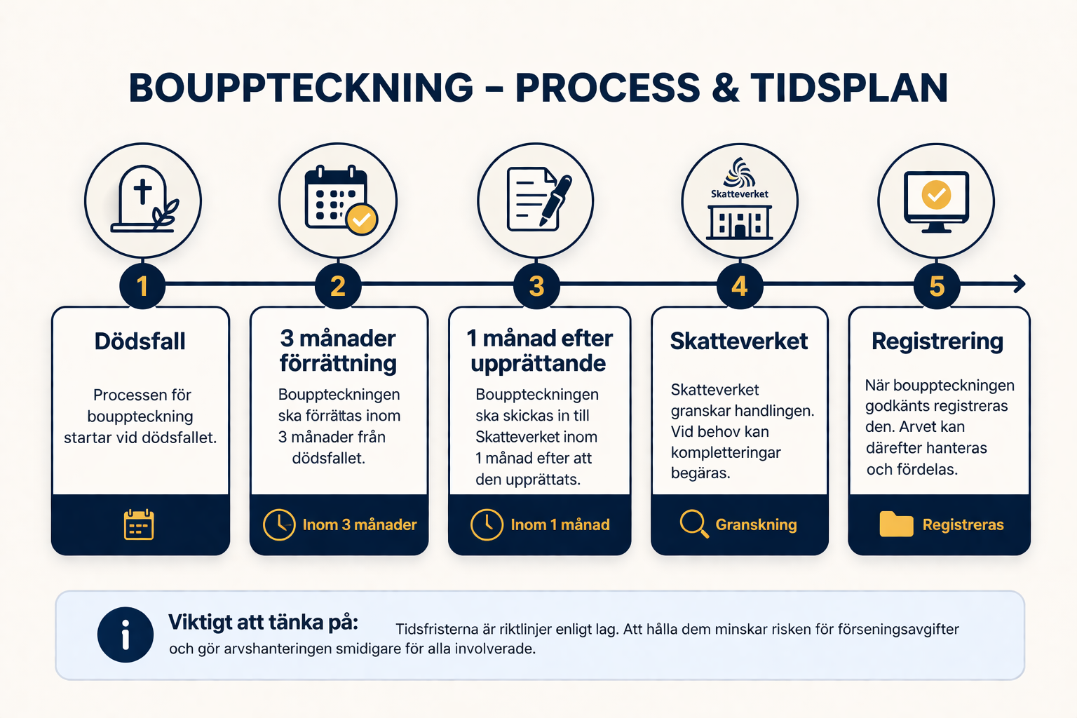 Bouppteckningen ska som huvudregel förrättas senast tre månader efter dödsfallet och därefter ges in inom en månad efter upprättandet.