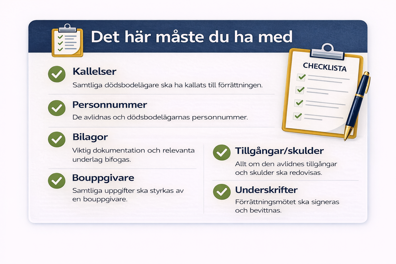 Under tiden ligger ansvaret fortfarande på de anhöriga att få ordning på kallelser, uppgifter, bilagor och tidsfrister. Och med nuvarande kötid hos Skatteverket har man sällan råd med missförstånd som leder till kompletteringar eller onödiga omvägar.