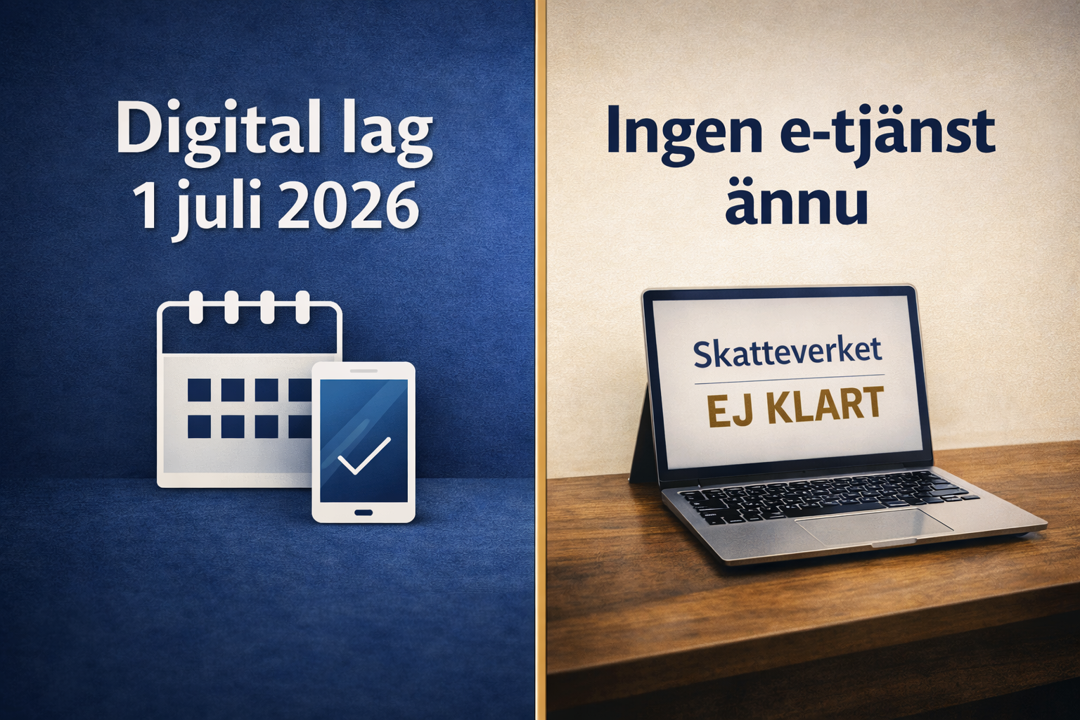 Blanda inte ihop ny lag med färdig digital tjänst. Planera för verkligheten som den ser ut under övergången 2026–2027. Det är en praktisk slutsats utifrån Skatteverkets och lagstiftarens nuvarande besked.