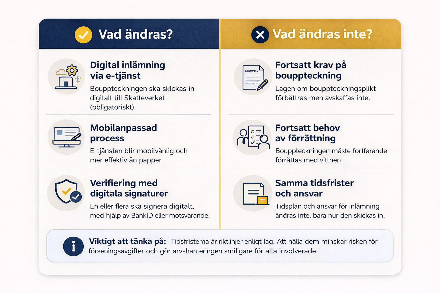 | Tydligare krav på identitetsuppgifter | Behovet av registrerad bouppteckning i praktiken kvarstår |
