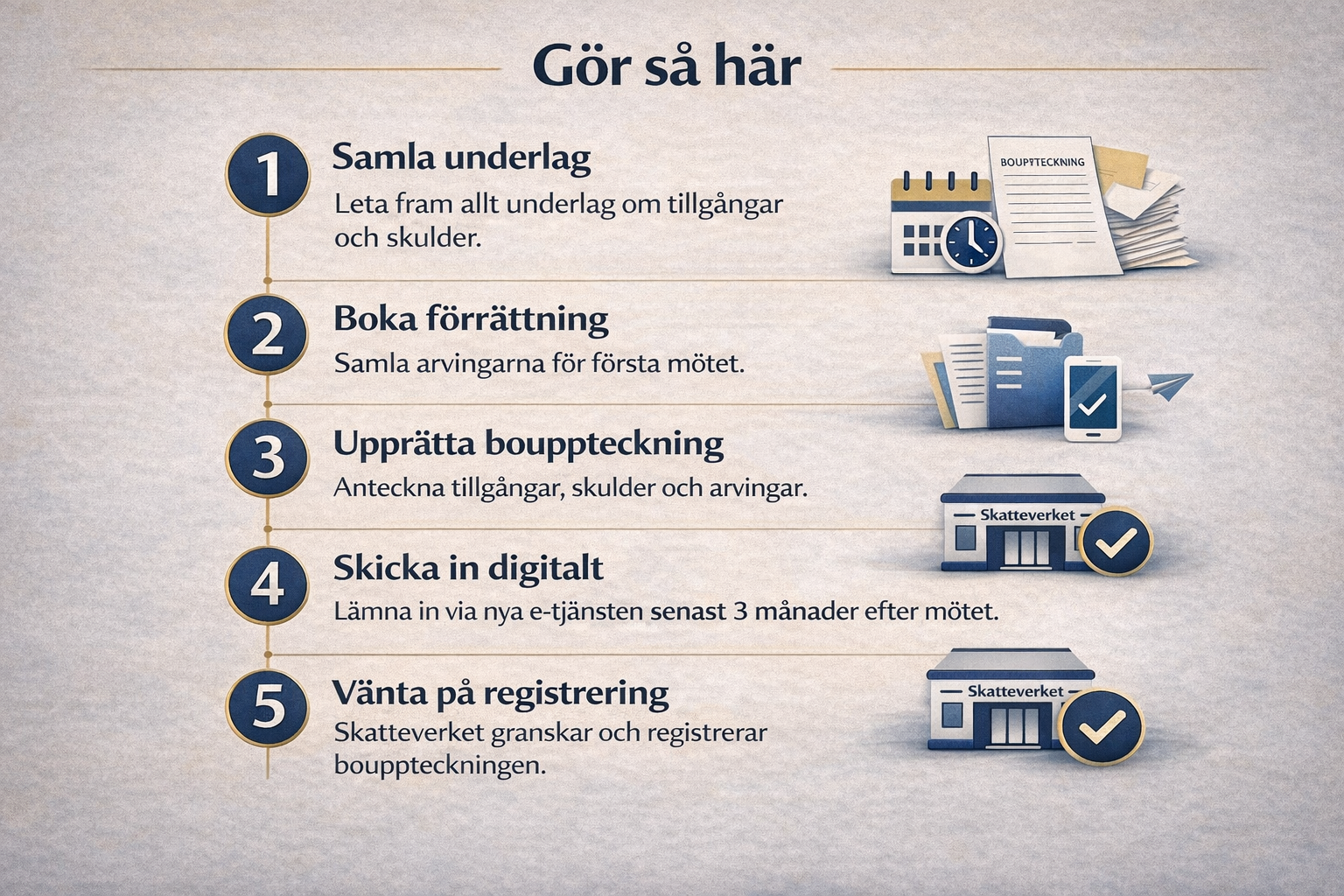 Från 1 juli 2026 blir digital inlämning av bouppteckningar och dödsboanmälningar möjlig enligt lag. Men Skatteverket har ännu ingen e-tjänst, och en digital lösning kan komma tidigast under 2027. Pappersformen ska finnas kvar, och i praktiken behöver du därför fortfarande planera för kallelser, bilagor, underskrifter och fysisk inlämning. Skatteverkets kötid ligger just nu på cirka 9 veckor.