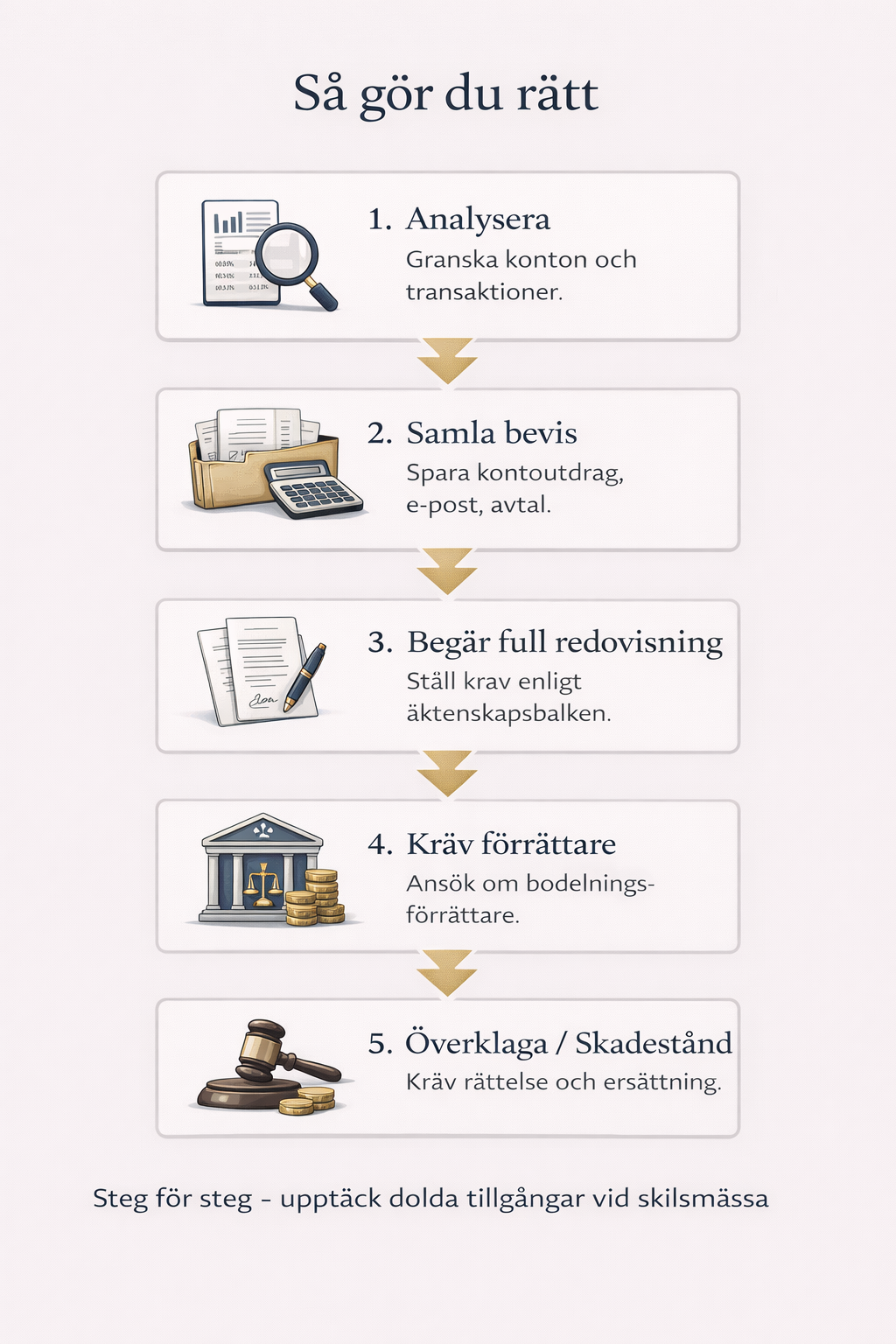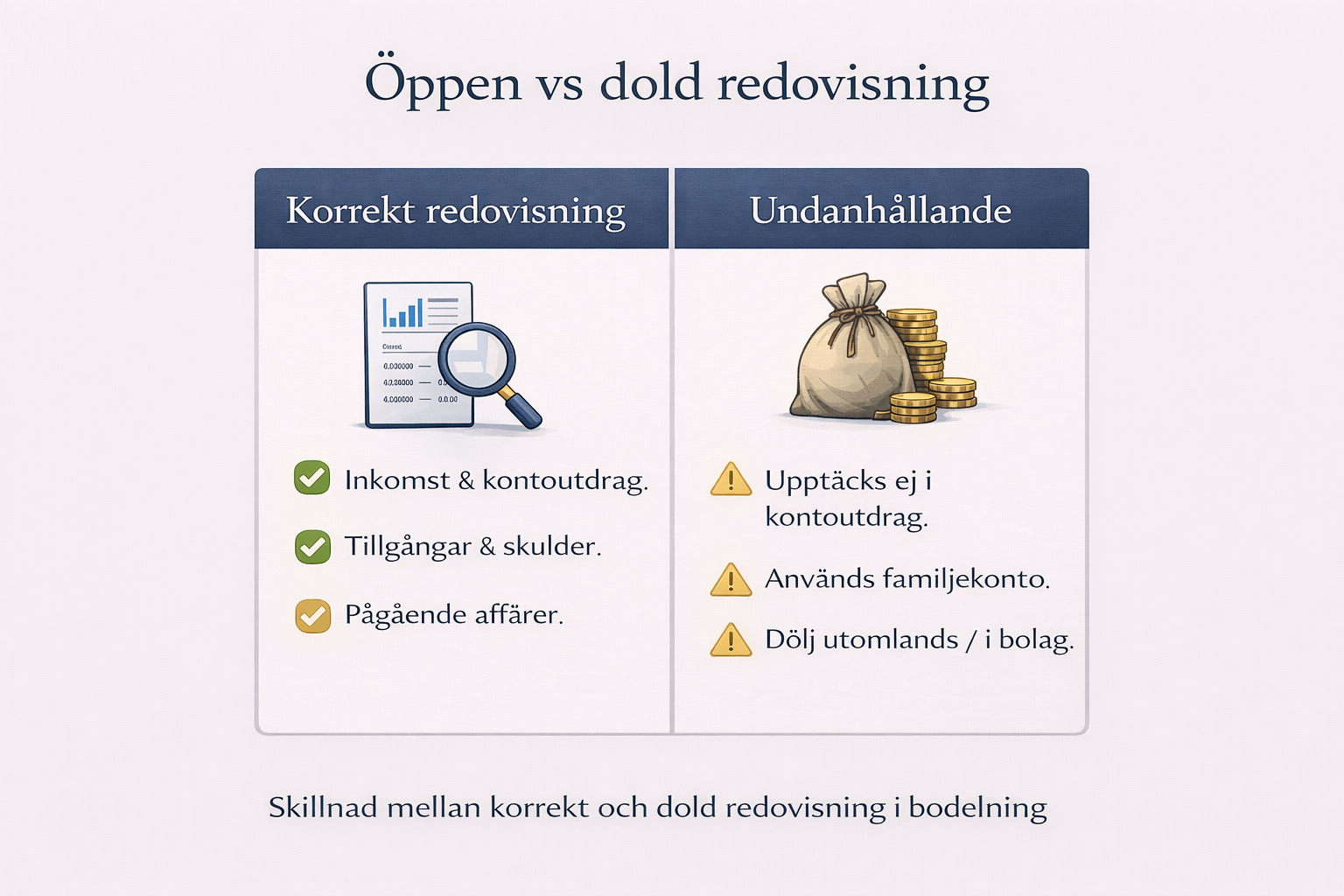 När ord står mot ord och dokumentation saknas blir rättsläget osäkert. Resultatet är ofta utdragna bodelningstvister, försenade uppgörelser och betydande kostnader – trots att lagen tydligt kräver full insyn och korrekt redovisning vid skilsmässa.