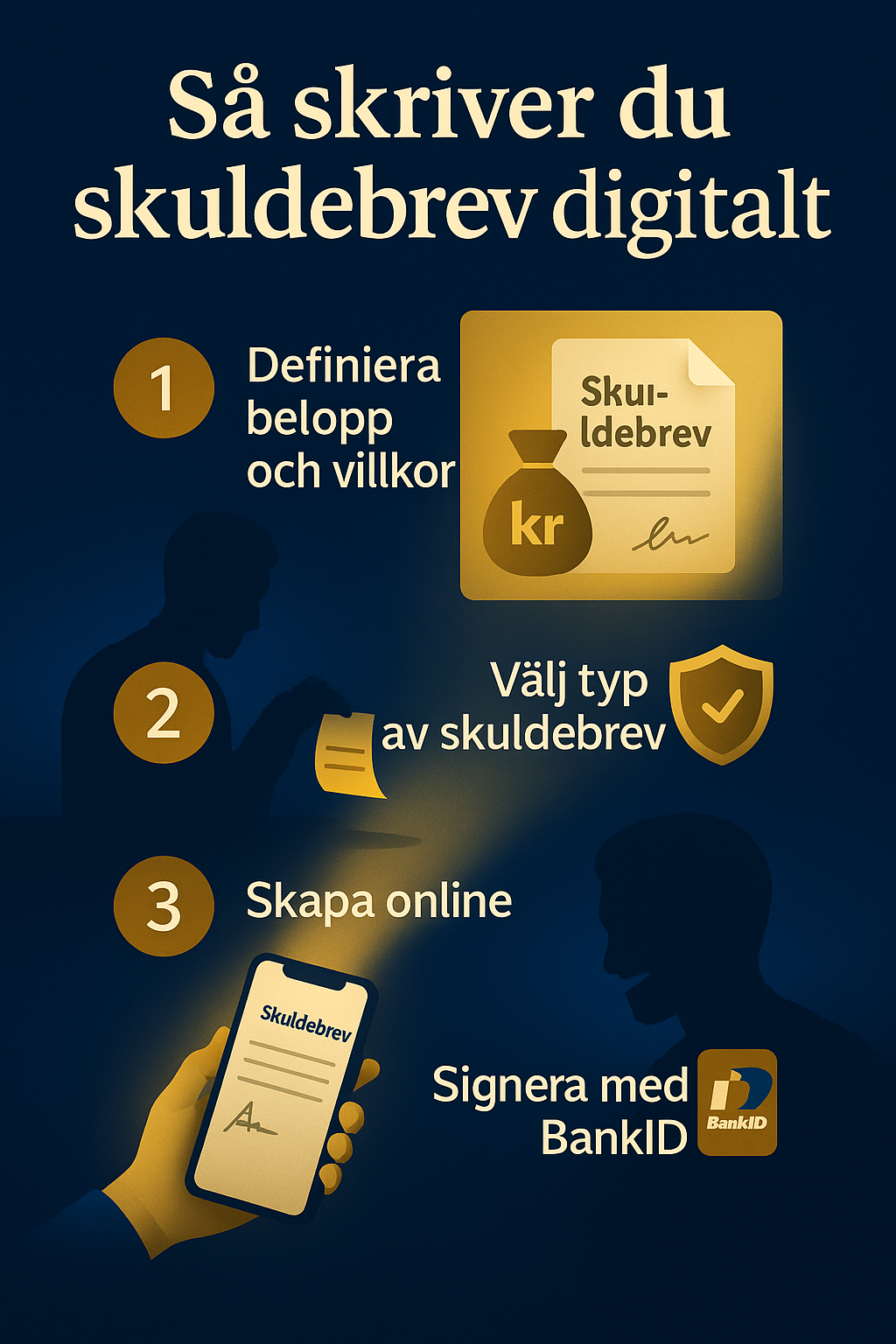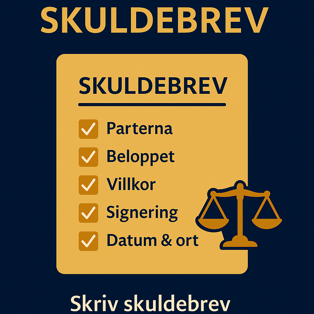 | Enkelt skuldebrev | Privatperson → vän/familj | “Anna lånar 30 000 kr av Erik.” | Kan inte överlåtas fritt. Överlåtelse kräver denuntiation (§ 27 SkbrL). Rekommenderas för privat bruk. |