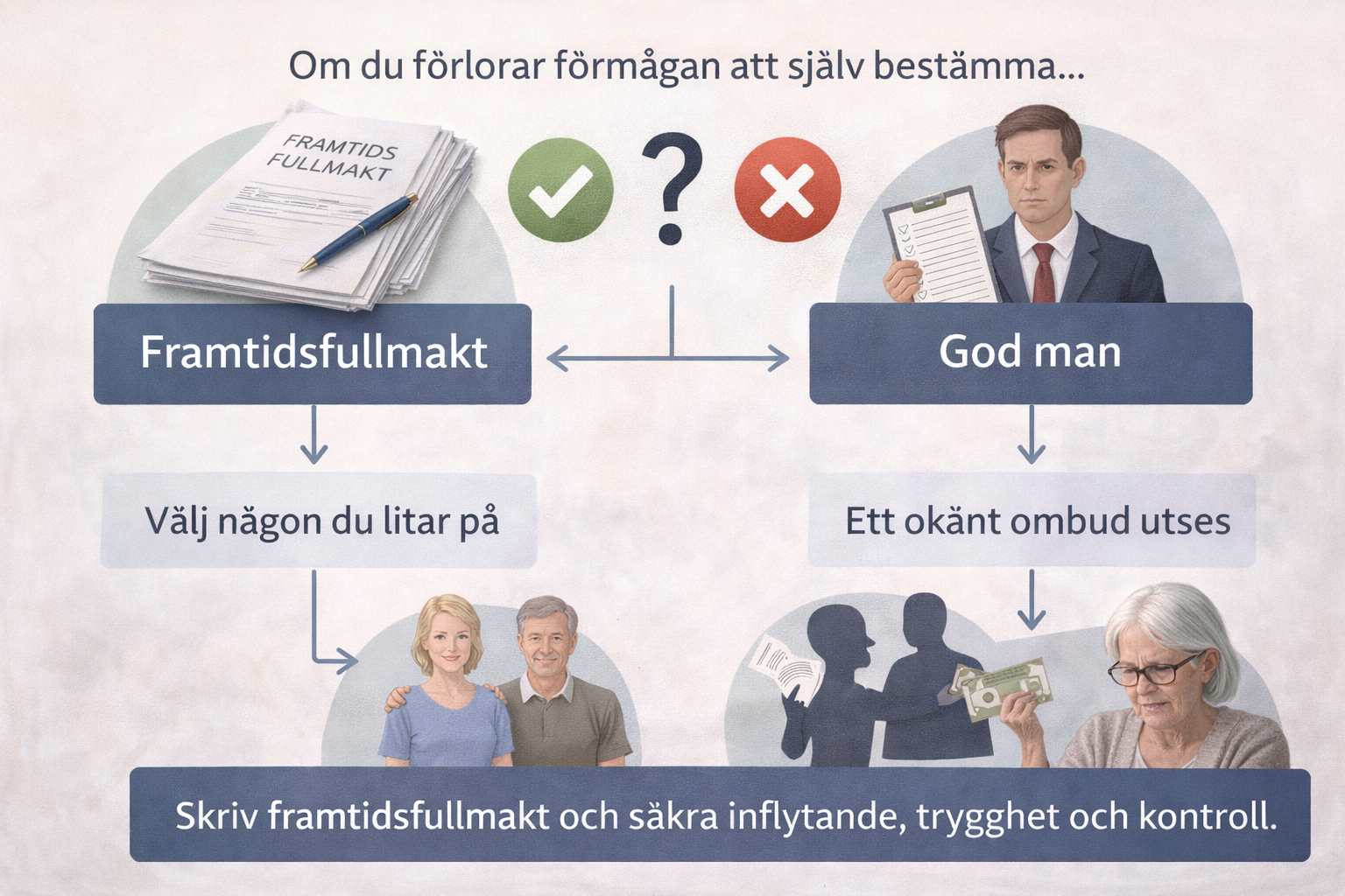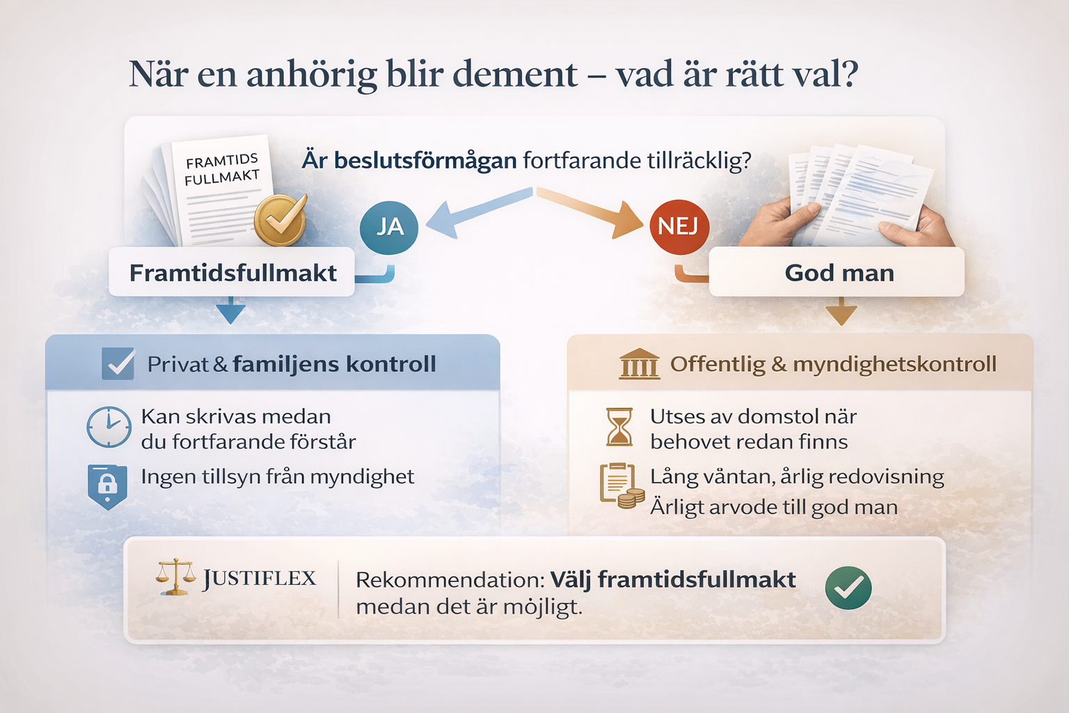 Framtidsfullmakt är det bästa valet om den upprättas i tid. Den ger familjen kontroll, snabbhet och ingen löpande myndighetstillsyn. God man blir aktuellt först när beslutsförmåga saknas, men innebär lång handläggning, årlig redovisning och tillsyn. Prioritera framtidsfullmakt så tidigt som möjligt.