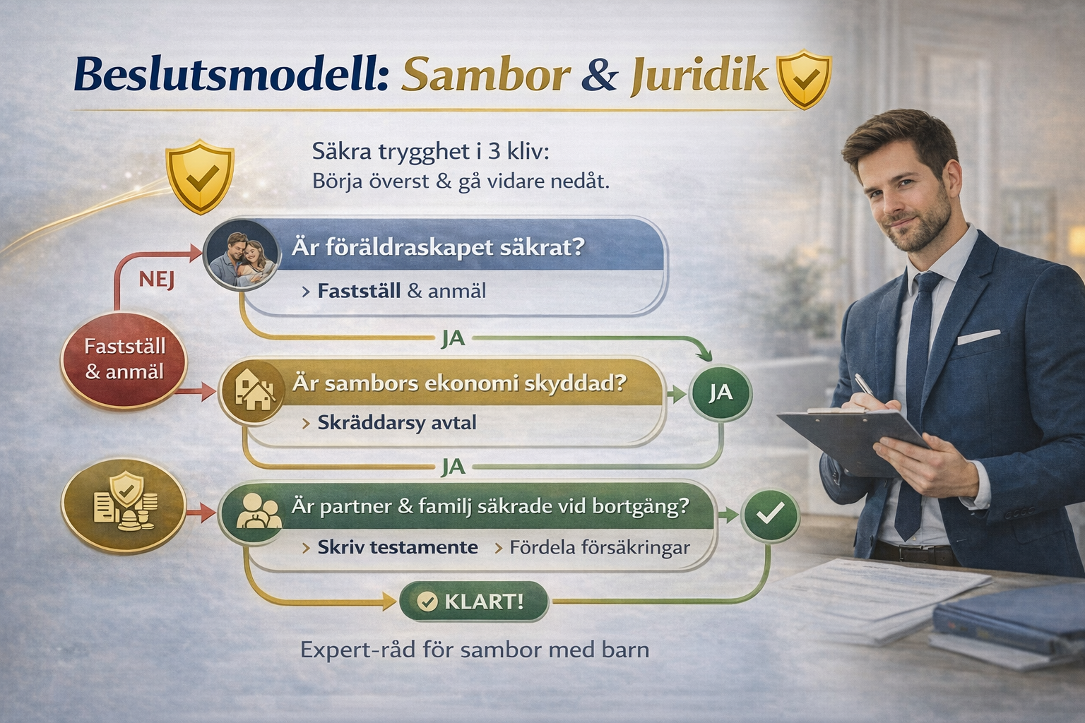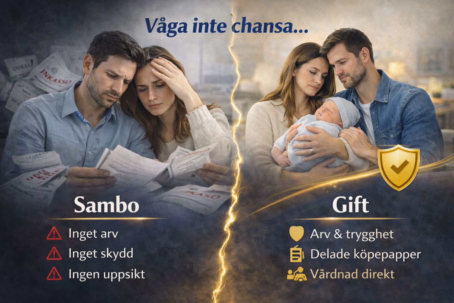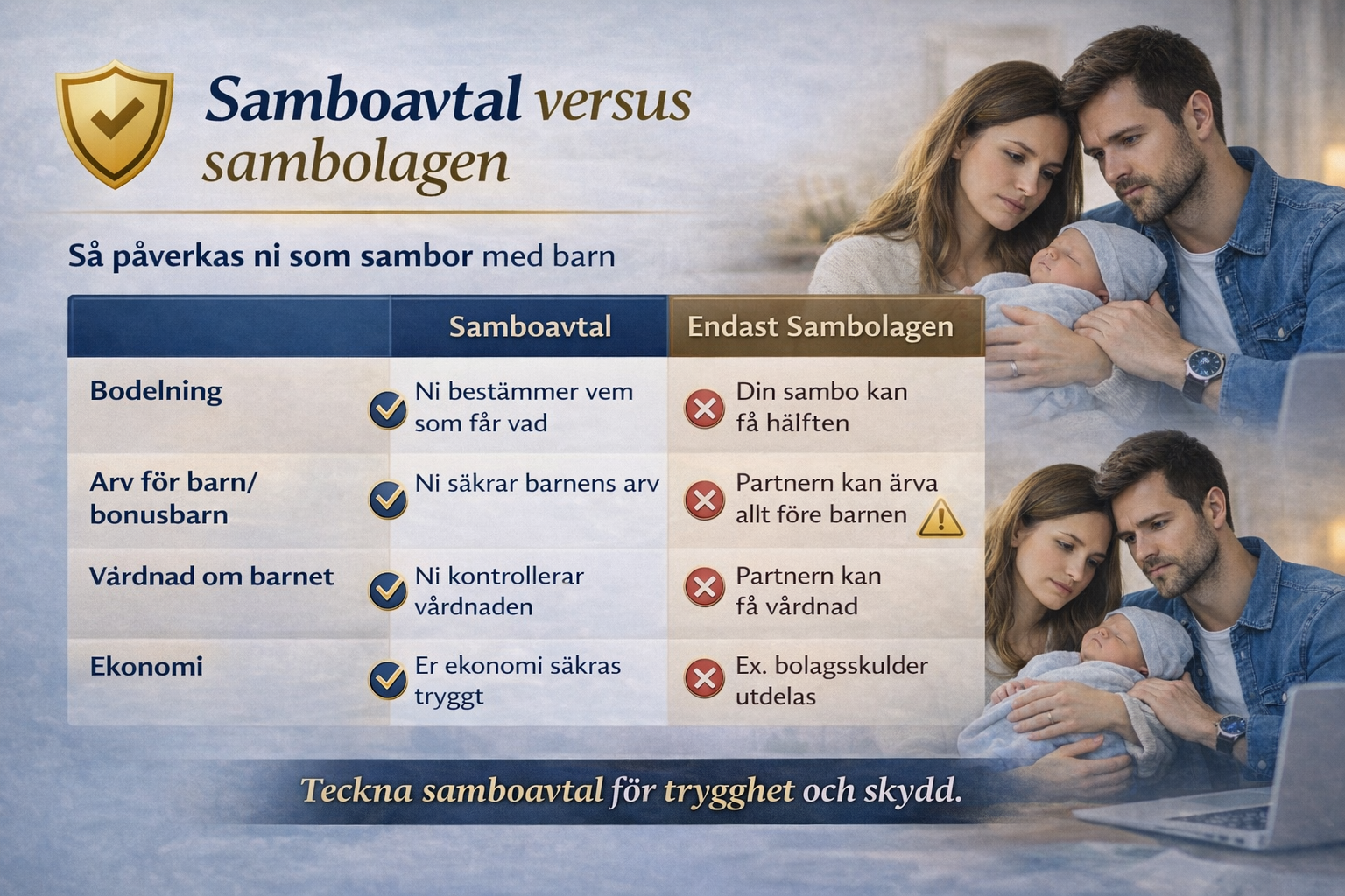 Vi möter regelbundet sambor som tror att barnet “binder ihop” skyddet. När något oväntat händer – separation, sjukdom eller dödsfall – kan konsekvensen bli förlust av bostad, låsta pengar hos överförmyndare och onödiga konflikter. Det går att förebygga.