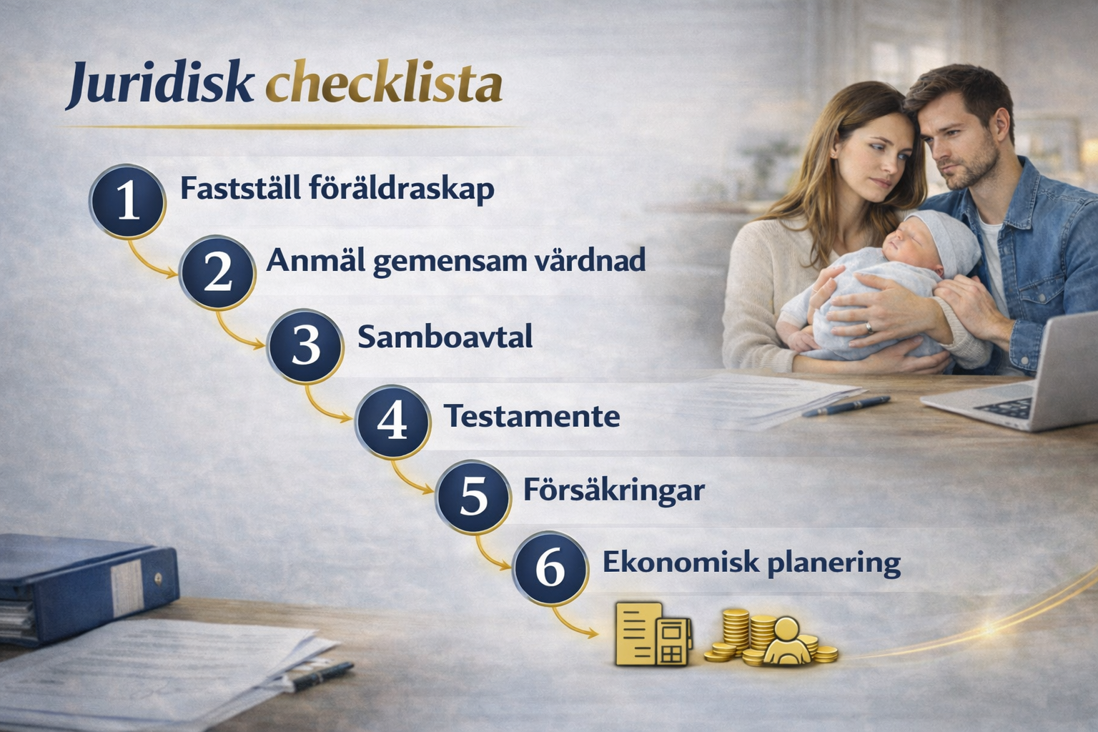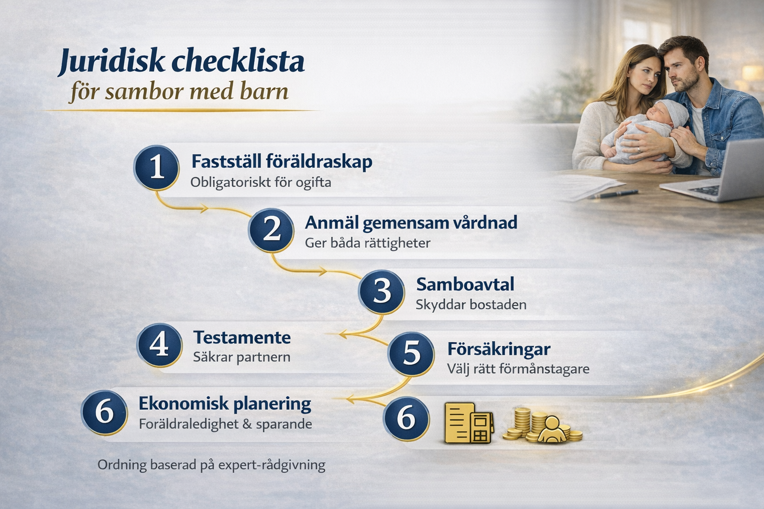 Föräldraskap & vårdnad → bostad → testamente → försäkringar → finjustering.