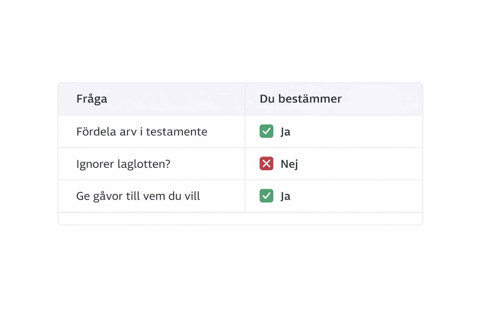| Testamentera bort allt? | ❌ | Laglotten stoppar | |