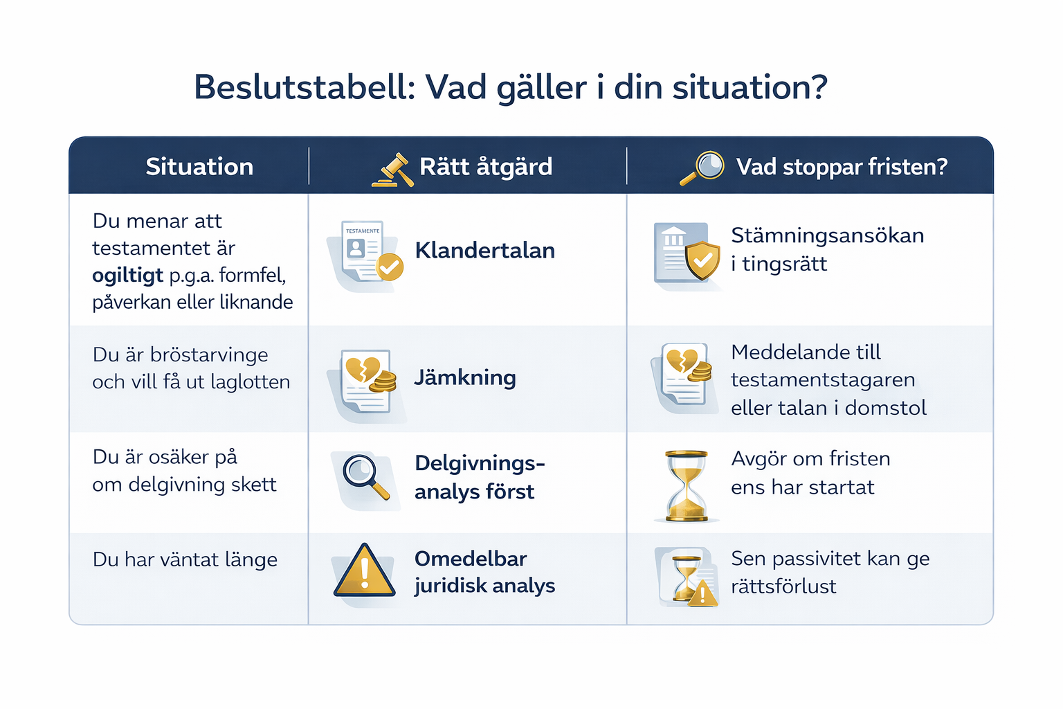 Du öppnar ett brev och inser att testamentet förändrar allt. Kanske misstänker du påverkan. Kanske ser du formfel. Kanske är du bröstarvinge och undrar om din laglott satts åt sidan. Det farliga är att tro att frågan kan vänta.