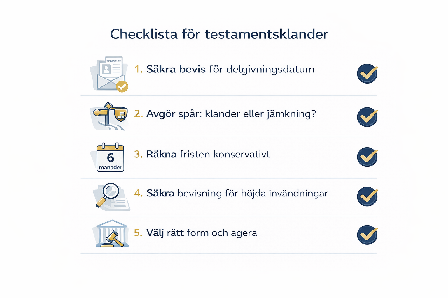 Om fristen missas kan testamentet i praktiken bli gällande trots invändningar som annars hade kunnat prövas. Det är därför detta är ett typiskt ämne med hög lead-intent: det rör nästan alltid ett konkret testamente, ett konkret dödsbo och en konkret tidsrisk.