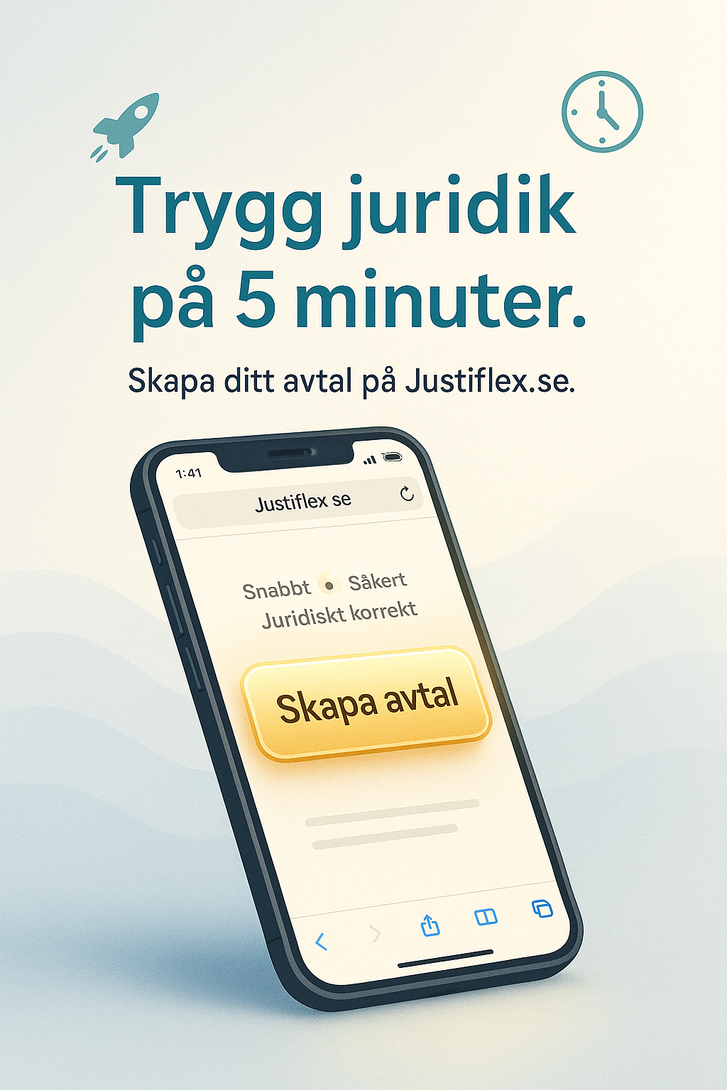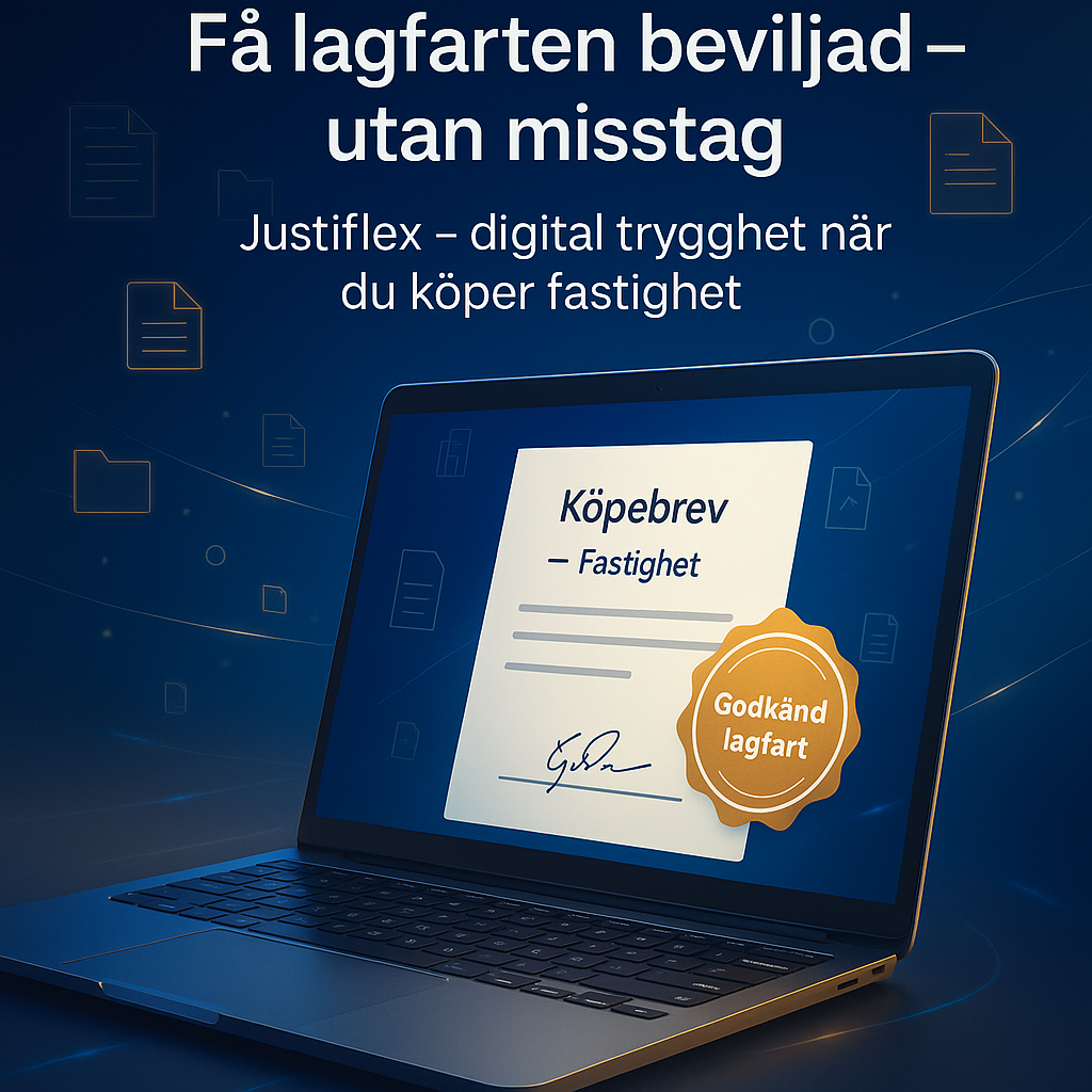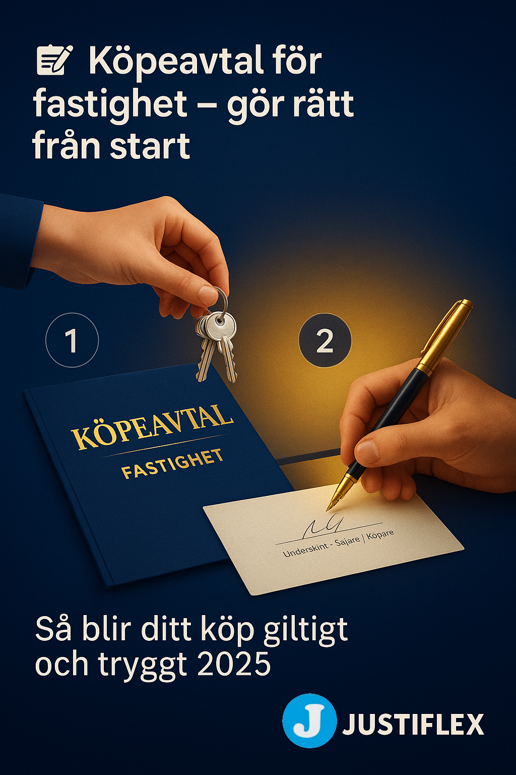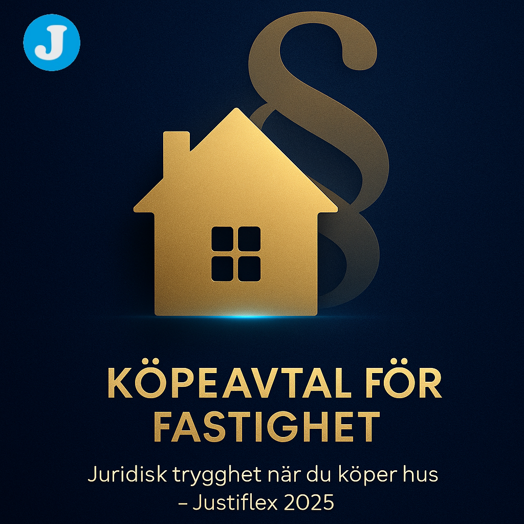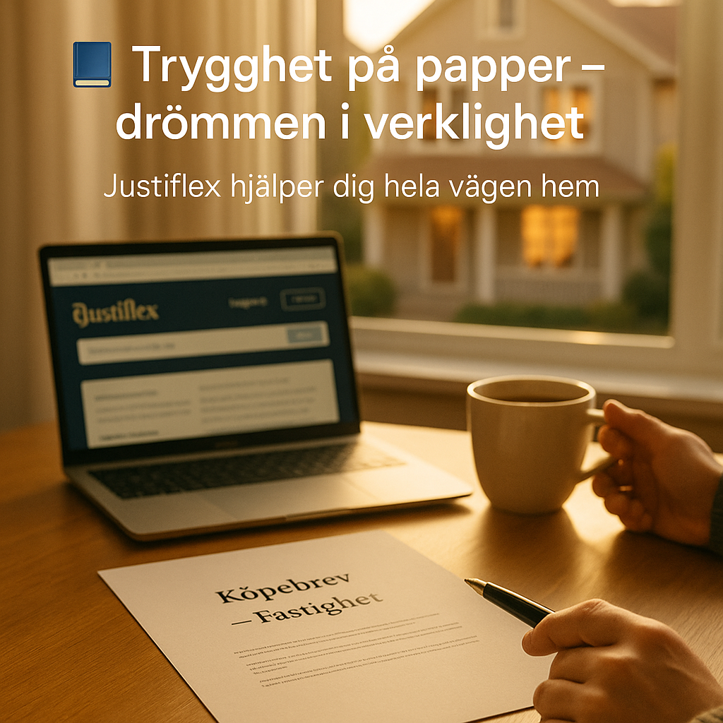 På Justiflex får du mall + juriststöd för köpekontrakt/köpebrev – rätt från början och klart för lagfart.