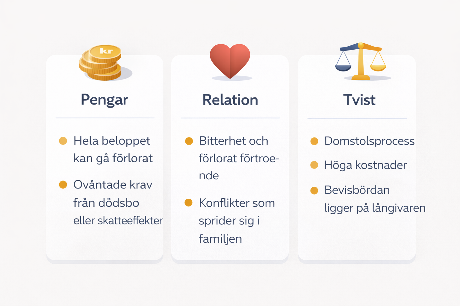 Konsekvens: Lånet tolkas som gåva – hela beloppet kan förloras.