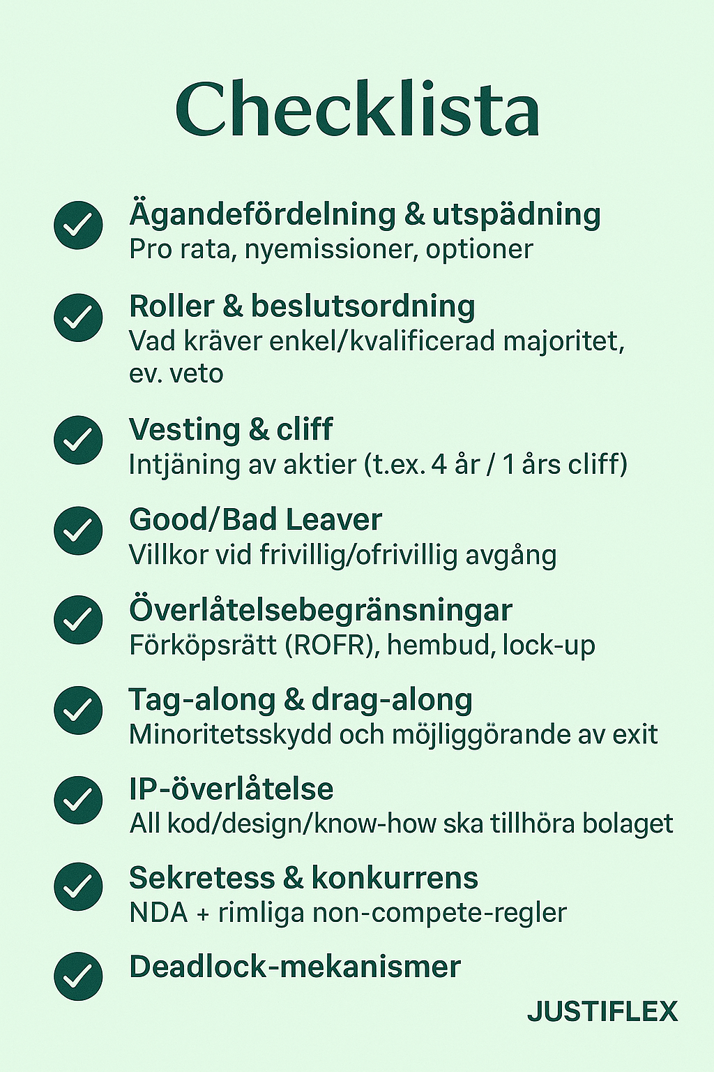Välkommen till Justiflex-bloggen – där juridik blir din turbo, inte din broms. Idag: en hård lärdom från verkligheten och en kopierbar checklista som säkrar ditt team på cirka 15 minuter. Läs mer eller börja direkt på Justiflex.se/kompanjonsavtal.