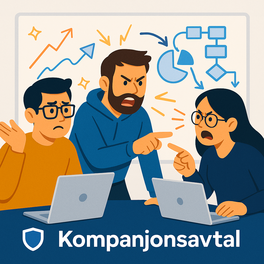 Utan kompanjonsavtal (aktieägaravtal) blir det en gröt av antaganden. Slack-tråden blir mejlkrig, som blir stämning. Verksamheten fryser, pengar brinner – och vänskapen offras för “bolagsnytta”. Spoiler: alla förlorar.