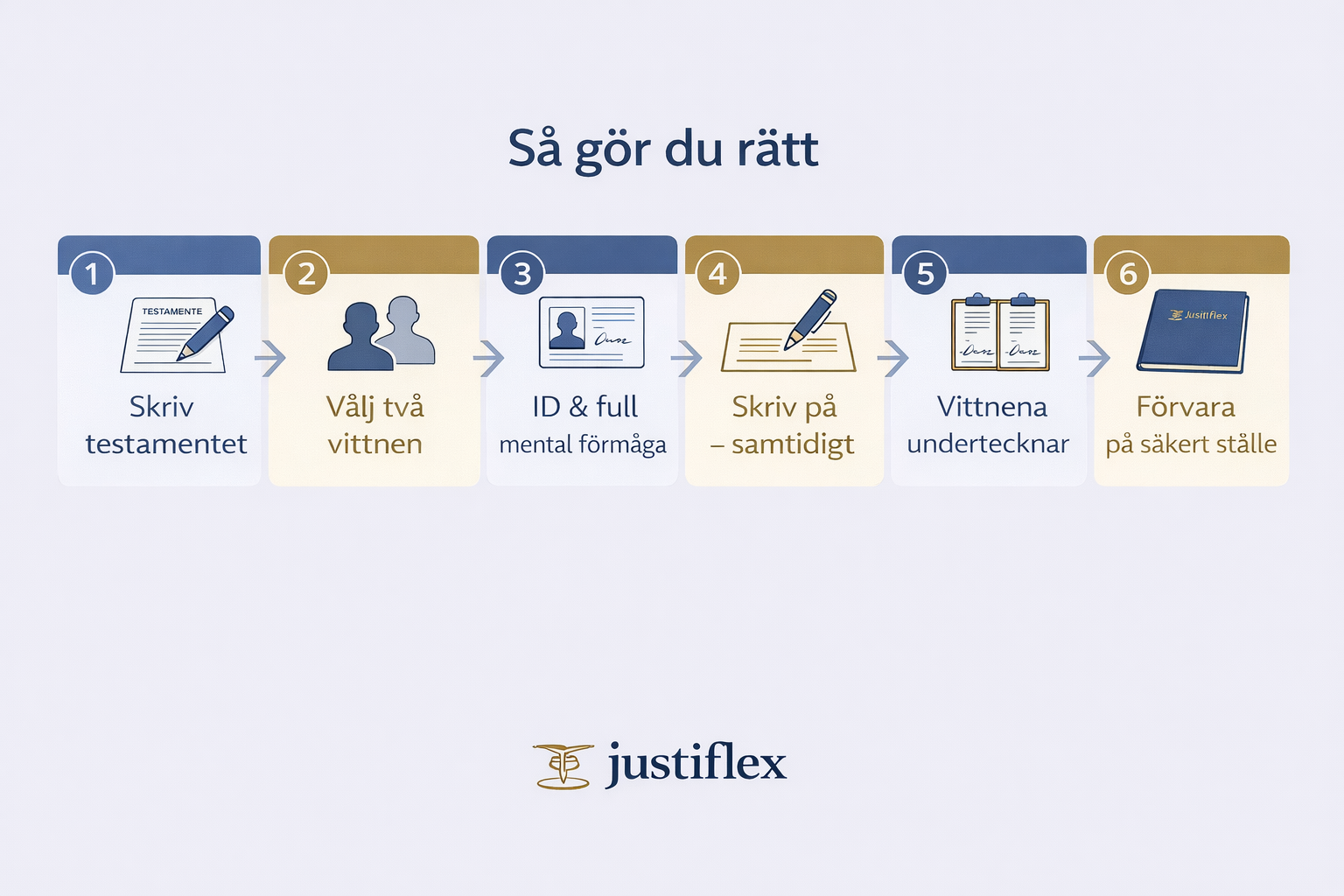 Testamentet måste vara skriftligt och bevittnat av två samtidigt närvarande, opartiska vittnen. Vittnen får inte vara arvingar eller närstående. Ett enda fel kan fälla allt.
