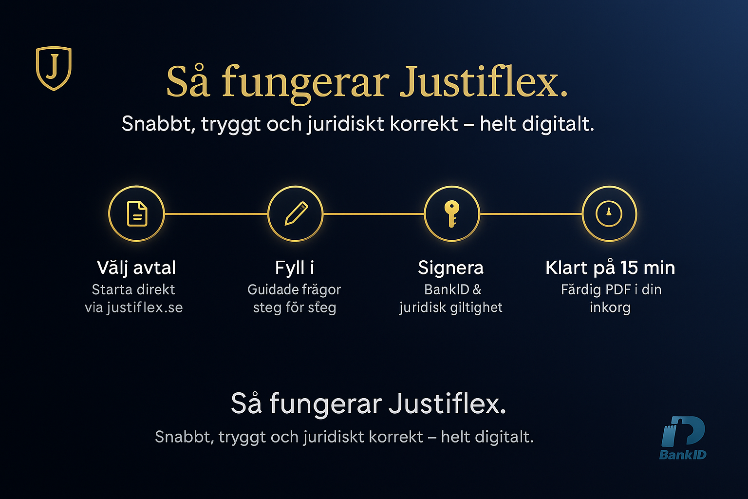 Hos Justiflex skapar du juridiskt hållbara dokument på bara 5–15 minuter.