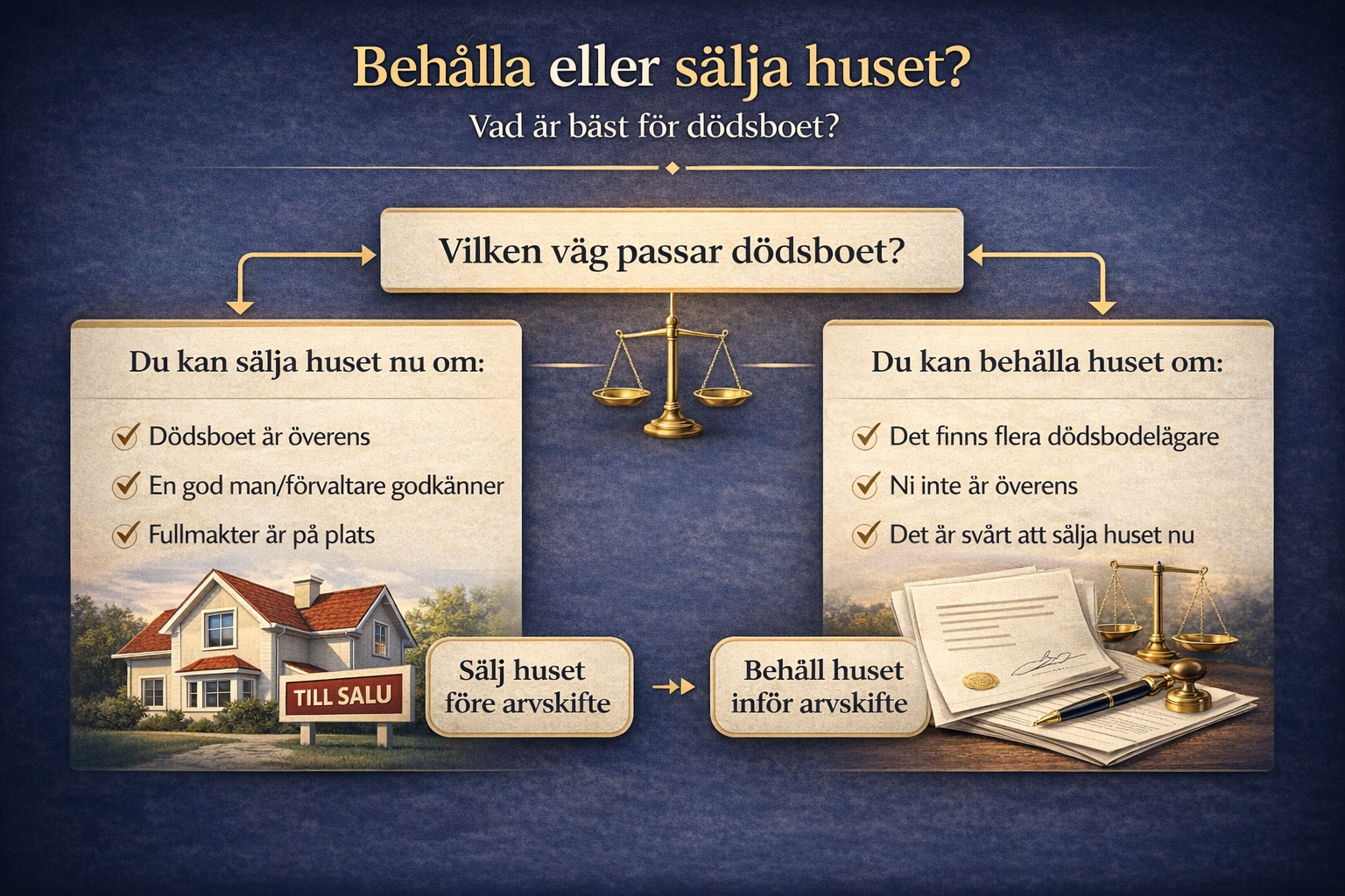 Den här artikeln är generell juridisk information och utgör inte individuell rådgivning. Bedömningen kan bli en annan beroende på testamente, efterarv, omyndiga delägare, internationell anknytning eller konflikt i dödsboet.