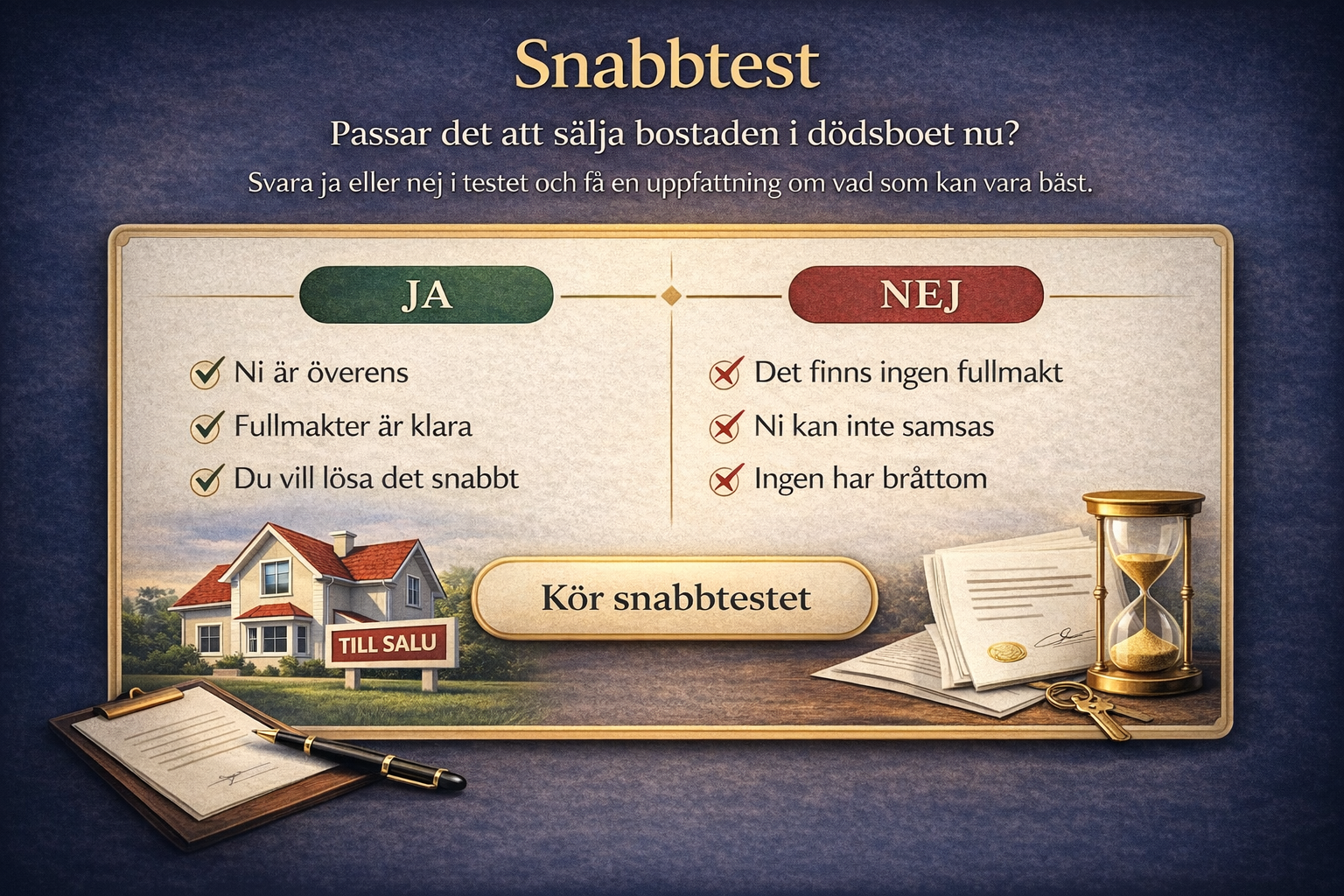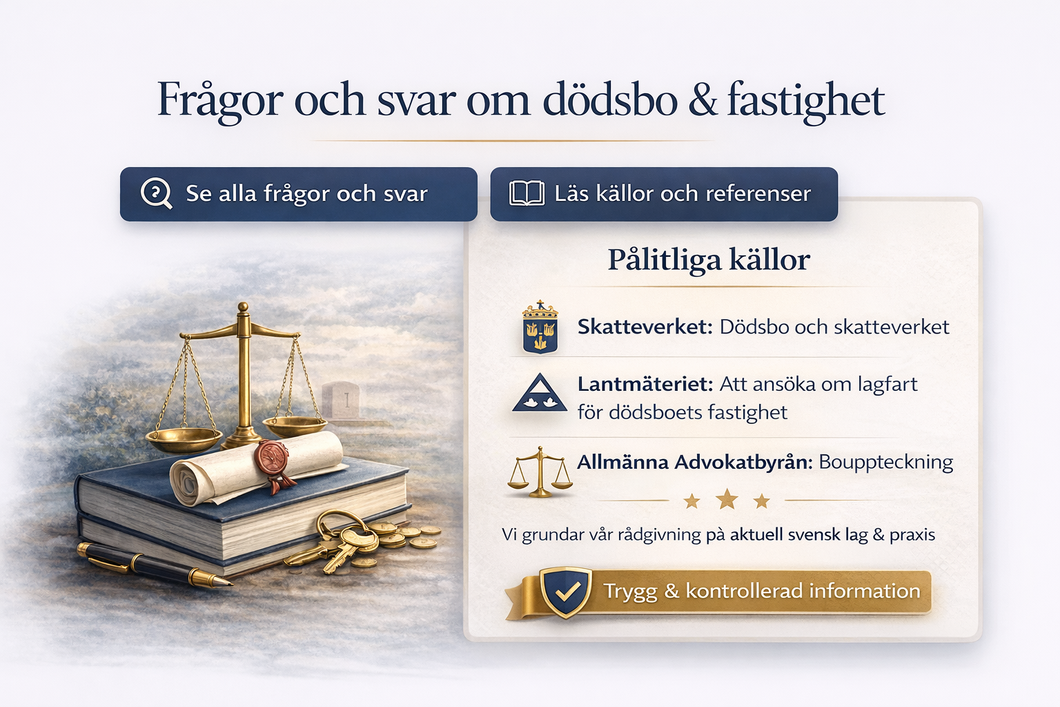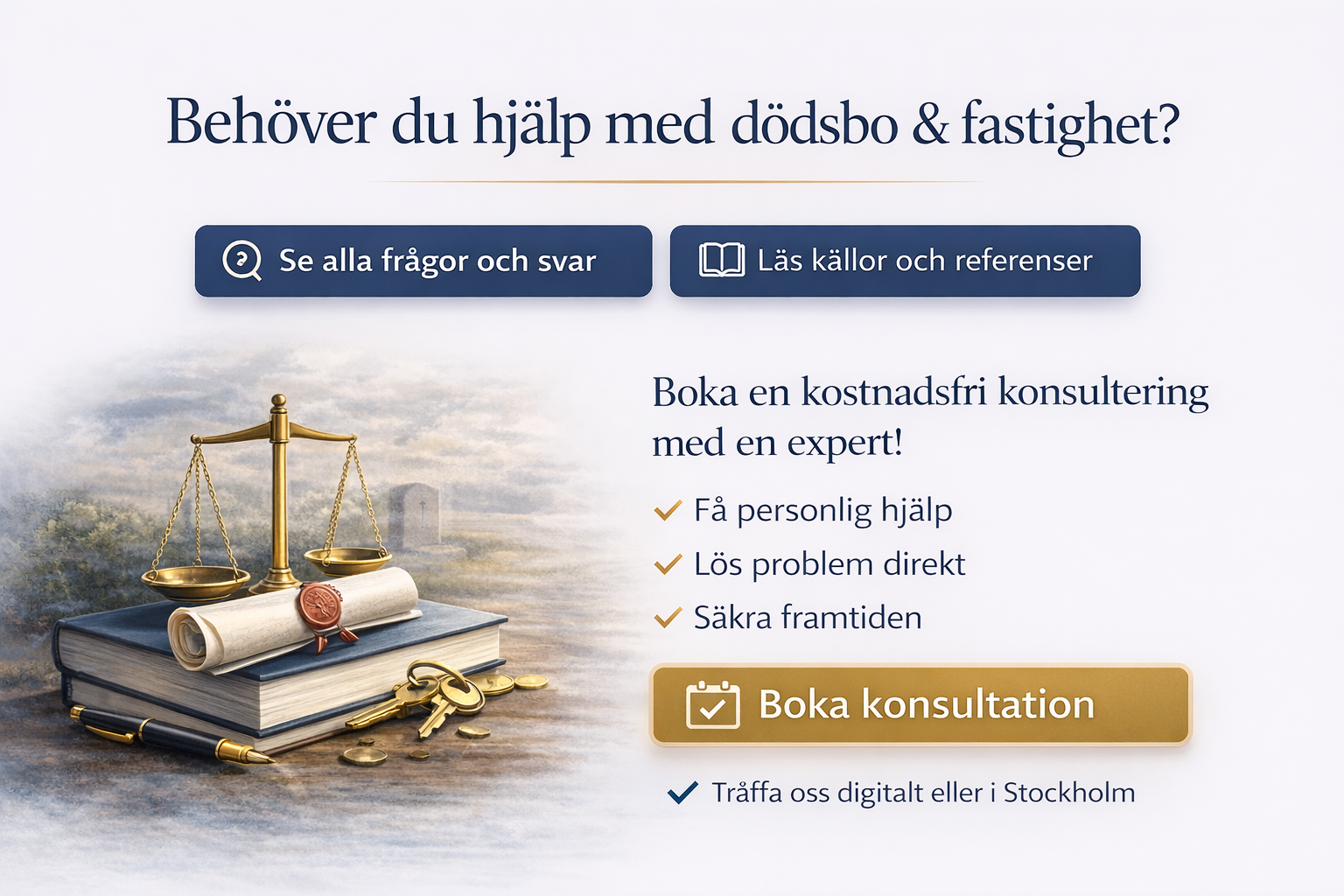 Det är exakt därför det här inte bara är en fråga om juridik på papper. Det är en fråga om rätt ordning, rätt underlag och rätt tempo. I 68 % av våra dödsbon med fastighet ser vi att rätt vägval från början sparar 4–8 veckor och minskar risken för att processen låser sig helt.