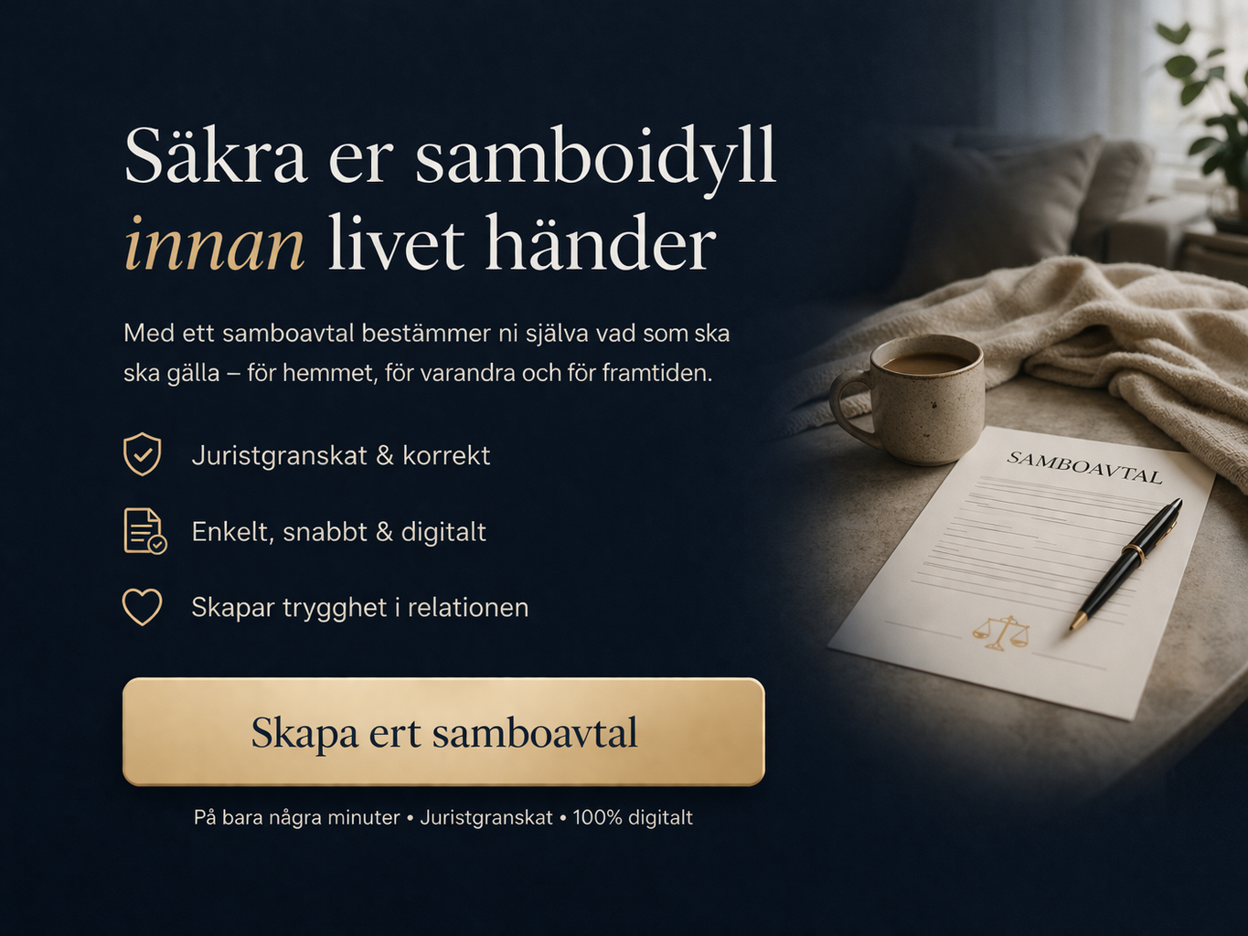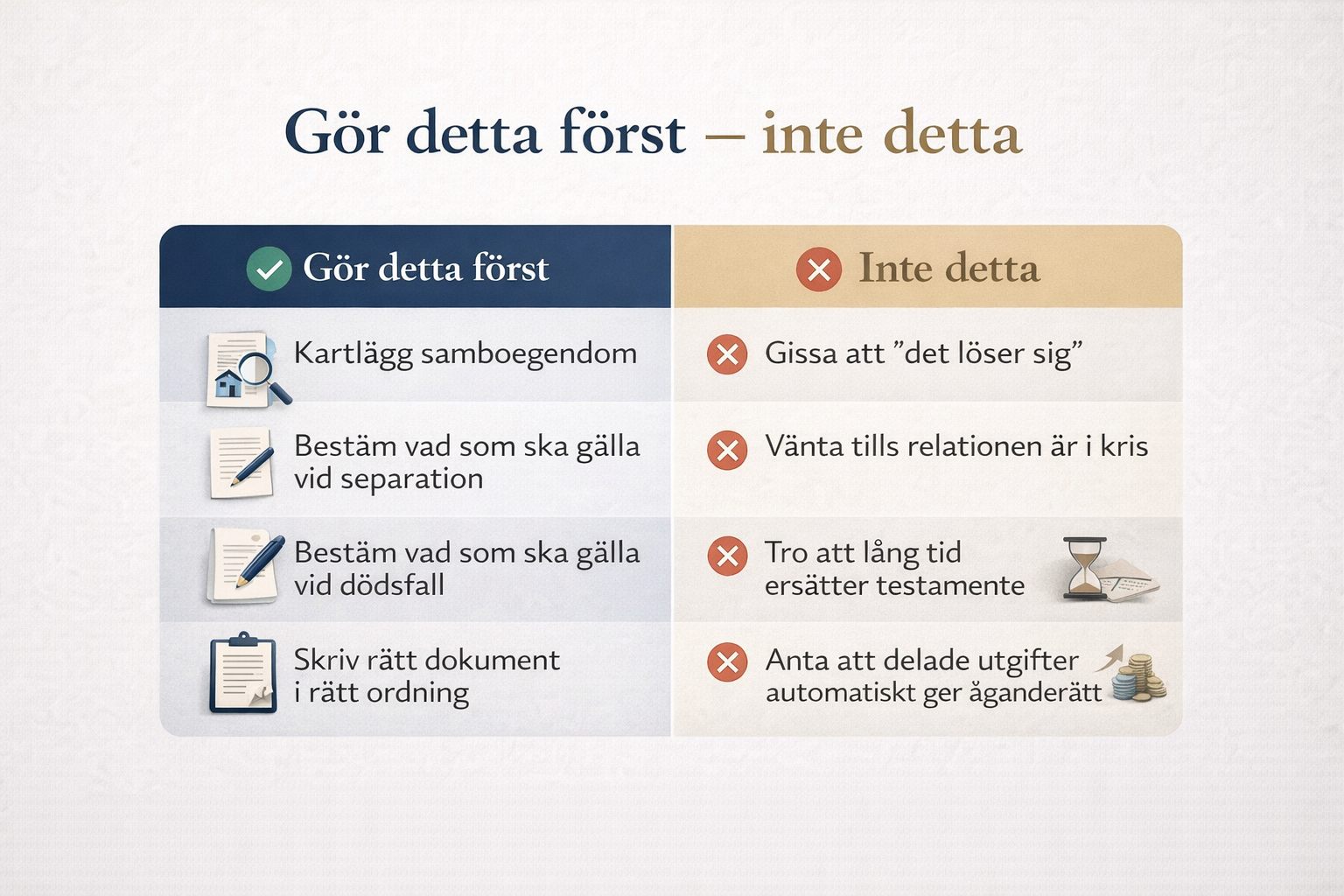 Det är inte alltid ett lagkrav att ta hjälp av jurist, men det är ofta klokt — särskilt om ni har bostad, barn, ojämna insatser eller vill skydda varandra vid dödsfall. Ett otydligt dokument kan skapa exakt den tvist ni försökte undvika.