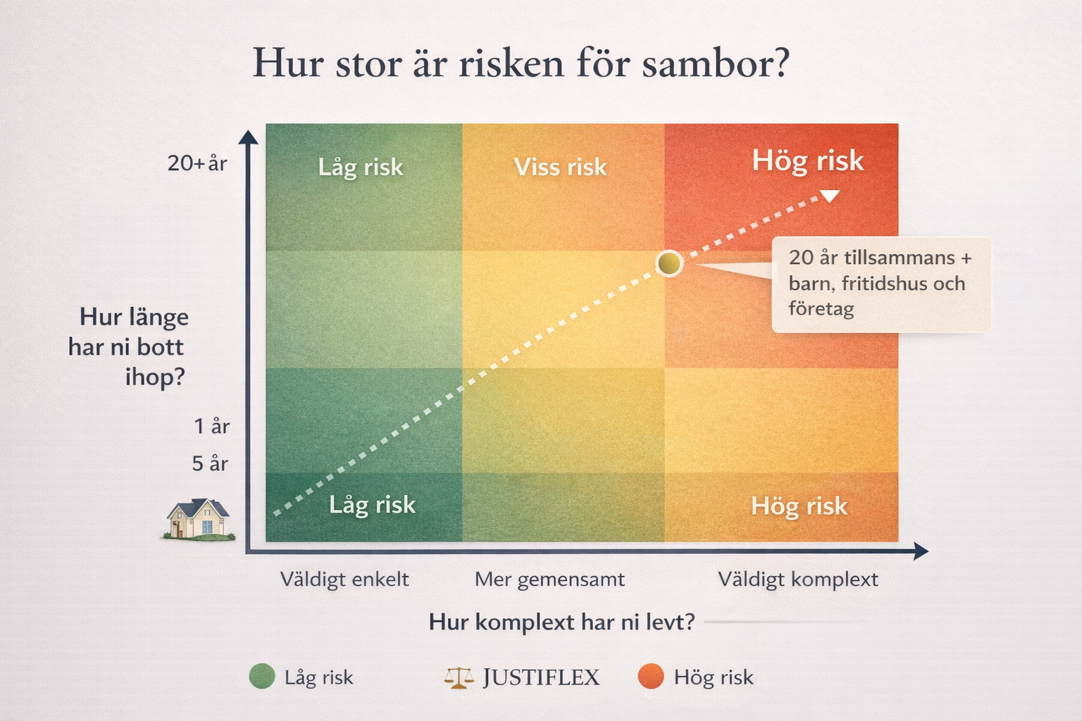 Det som lurar många är tiden. Man tänker att 15 eller 20 år tillsammans borde ge ungefär samma trygghet som ett äktenskap. Men sambolagen fungerar inte så. Den tittar inte på hur länge ni varit ihop, utan på vilken egendom ni har och hur den förvärvades.