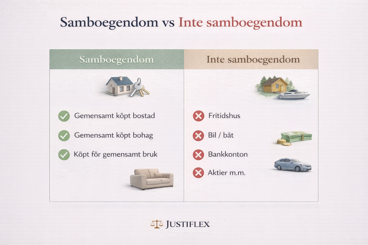 Sambolagens kärna är smal. Samboegendom är i huvudsak bara gemensam bostad och bohag som har förvärvats för gemensam användning, se 3 och 5 §§ sambolagen. Egendom som huvudsakligen används för fritid faller normalt utanför, och det gör även arv eller gåva med villkor om enskild egendom.