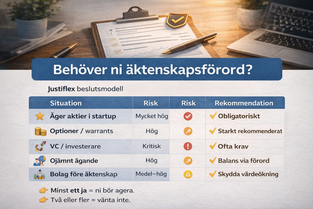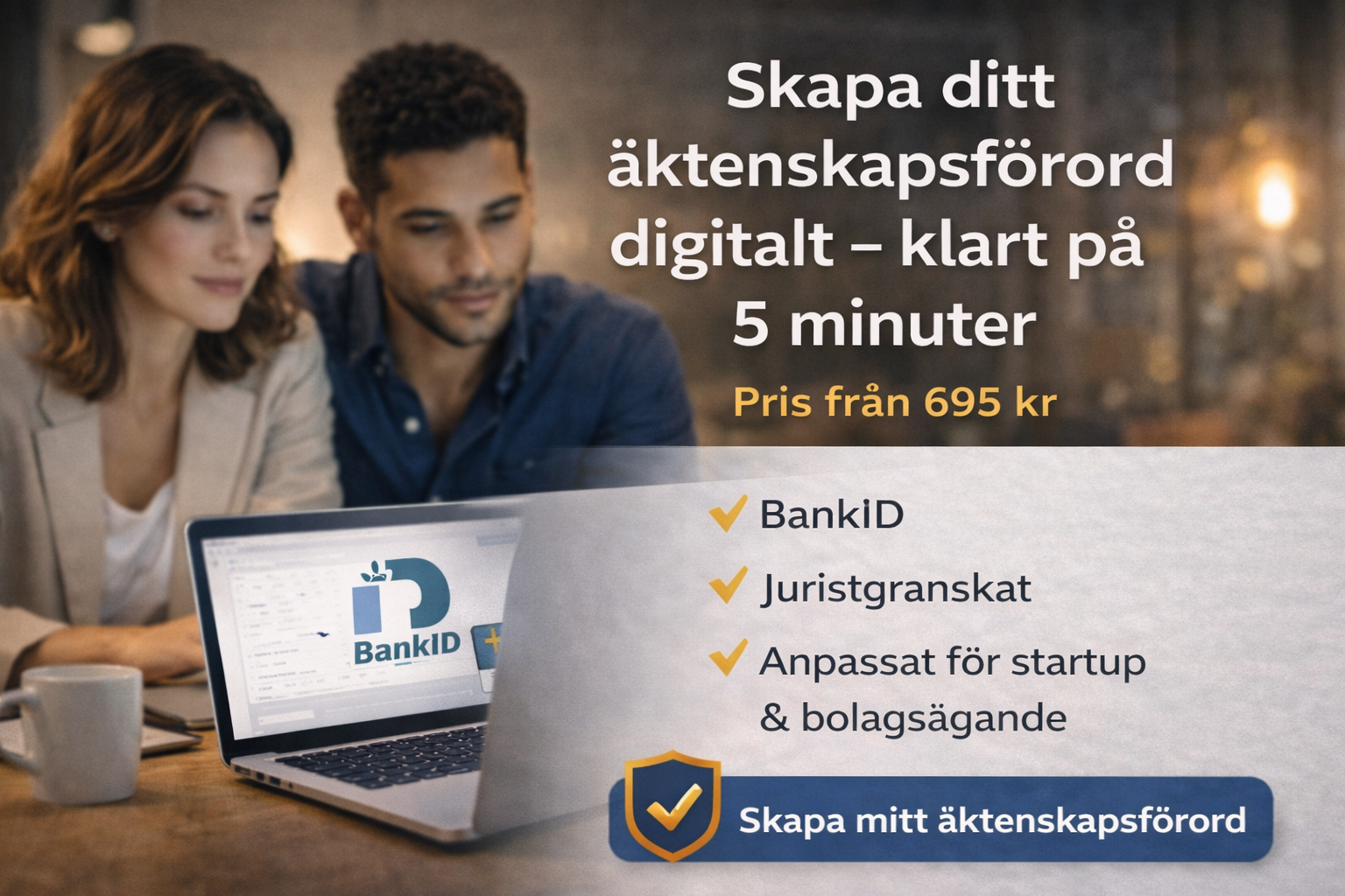 Driver du startup och är gift (eller ska gifta dig) utan äktenskapsförord riskerar du att aktier, optioner och framtida värde delas lika vid skilsmässa – även om din partner aldrig varit involverad i bolaget. Med ett korrekt äktenskapsförord enligt Äktenskapsbalken (1987:230) görs bolagstillgångarna till enskild egendom, vilket skyddar både bolagets kontroll och relationens stabilitet.