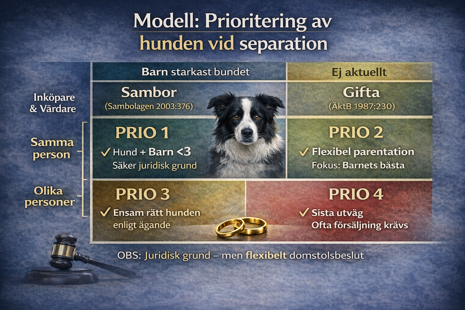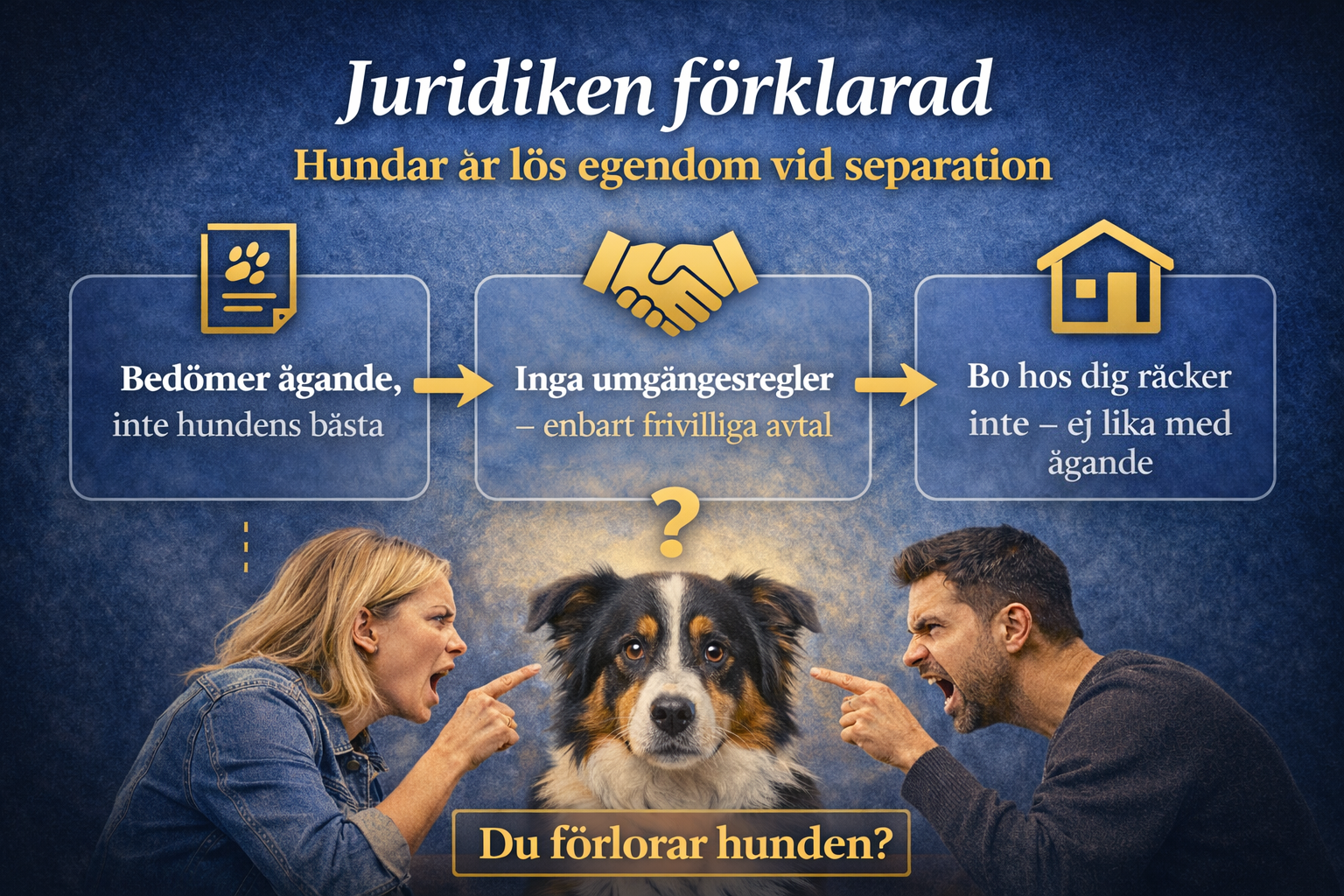 Vid separation betraktas hunden som lös egendom. Det är äganderätten som avgör – inte känslor eller vem som rastat hunden. Avgörande bevis är köpehandlingar, betalning och avtal. För sambor ingår hunden normalt inte i bodelning; för gifta kan den vara giftorättsgods. Avtal kan ändra utfallet.